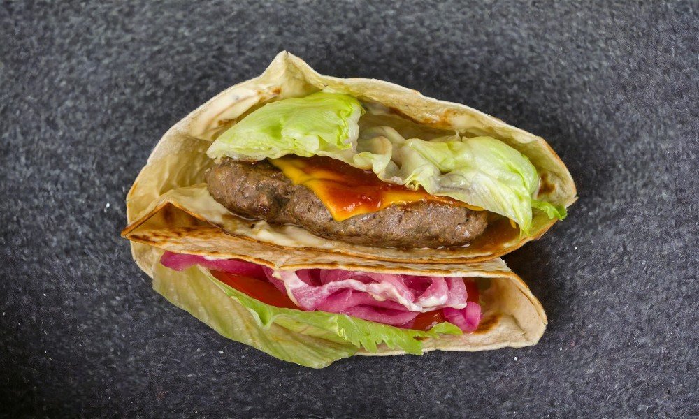 Liellopa gaļa, tortilja, salātu lapas, tomāts, marinēti sīpoli, Čedaras siers, ķiploku mērce, steiku mērce