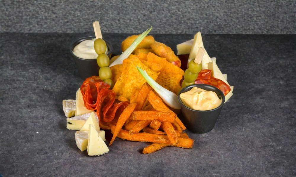 Vistas nageti, chorizo desa, brie siers, olīvas, nacho čipsi, saldo kartupeļu frī, siera mērce, ķiploku mērce