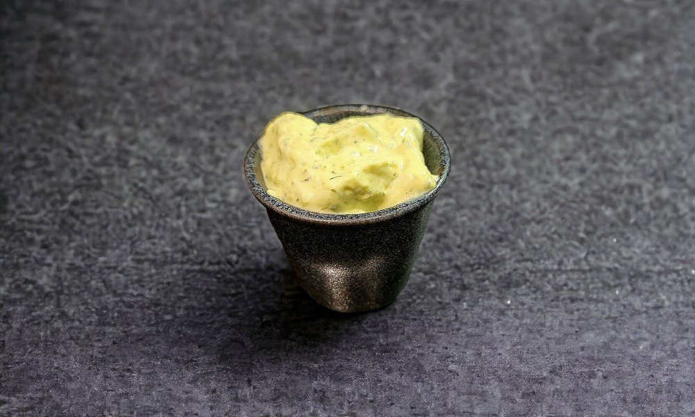 Brioša maize, kraukšīgā vista, bekons, siers, salātu lapas, marinēti gurķi, sīpolu marmelāde, diļļu mērce