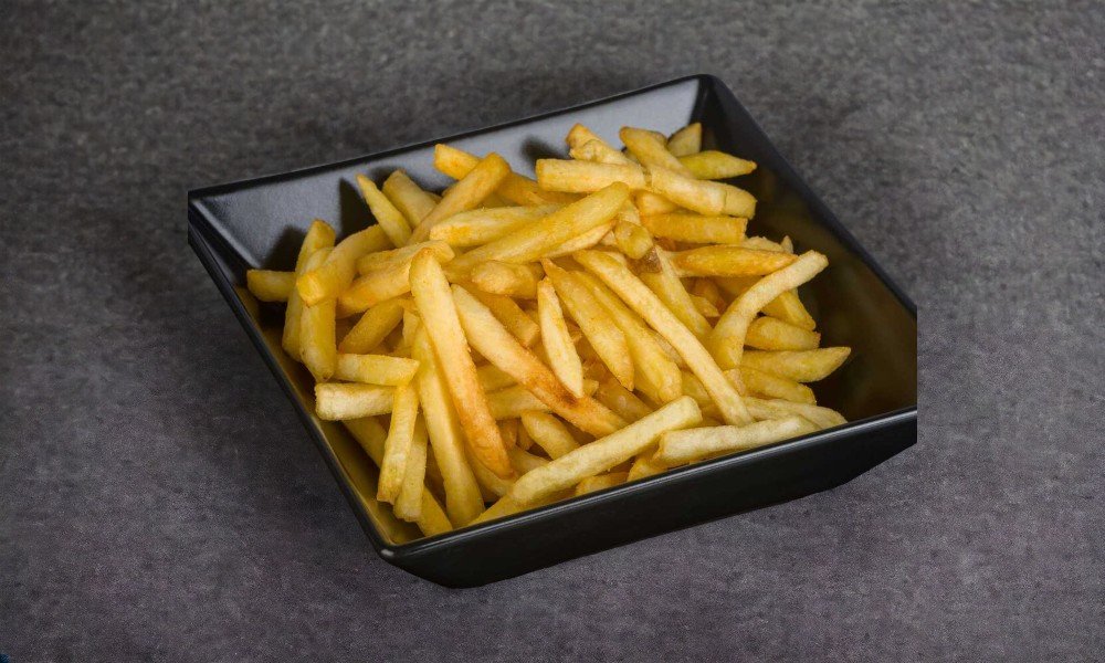 Mazs burgers, vista, frī kartupeļi, salātu lapas, tomāts, marinēti gurķi, sīpols, maiga steiku mērce, dzēriens