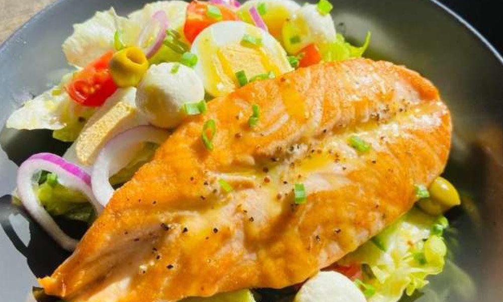 Laša fileja, salātu lapas, ķiršu tomāti, sīpoli, olīvas, olas, ķiploku siers, sinepju-eļļas mērce