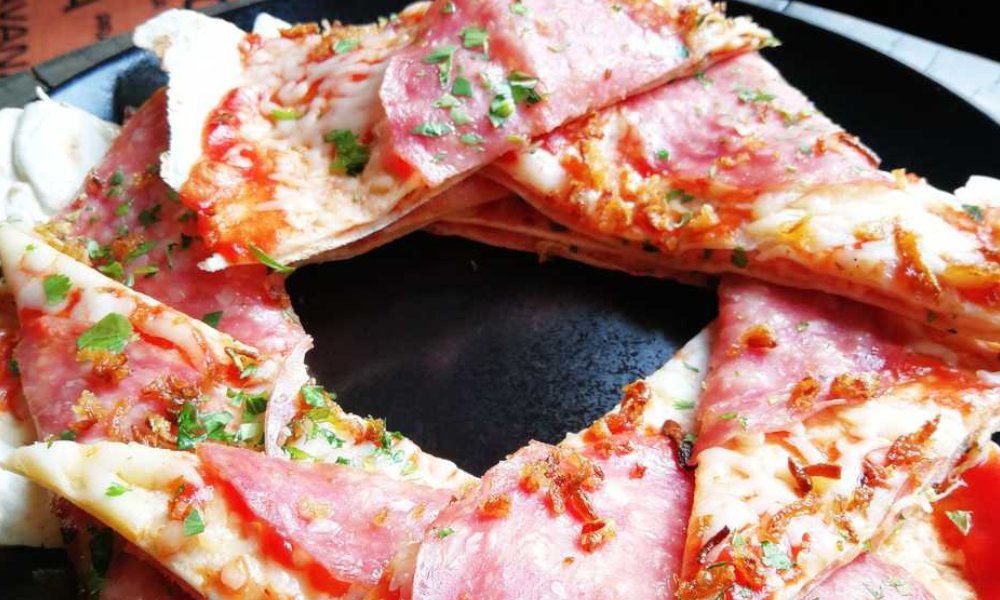 Tortiljas, tomātu mērce, siers, salami, cepti sīpoli, zaļumi