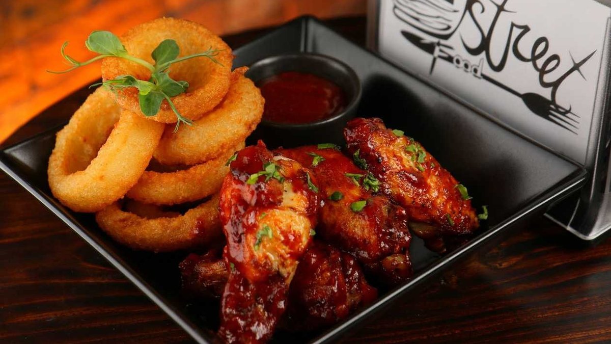 Kraukšķīga vistas fileja, salātu lapas, ķiršu tomāti, sīpoli, cepti sīpoli, pikanta karija-ananasu mērce, čilli mērce