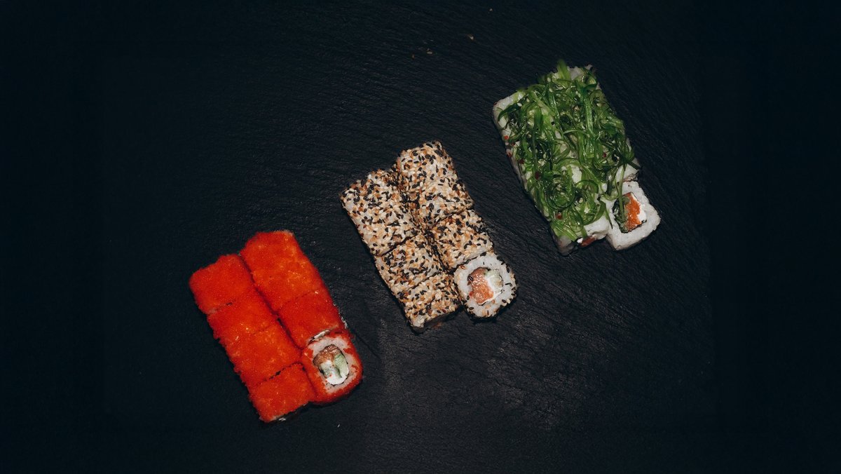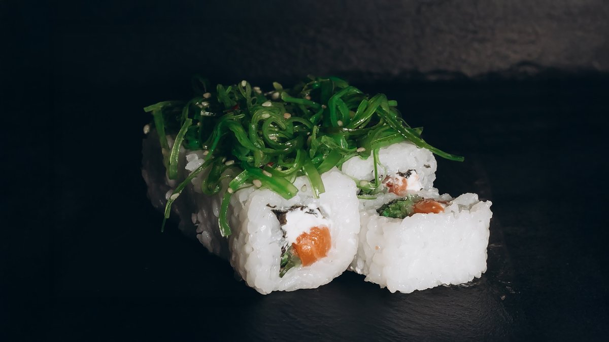Rīsi ,norī lapas, philadelphia, lasis, wakame, avokado, tempura, teriyaki mērce.