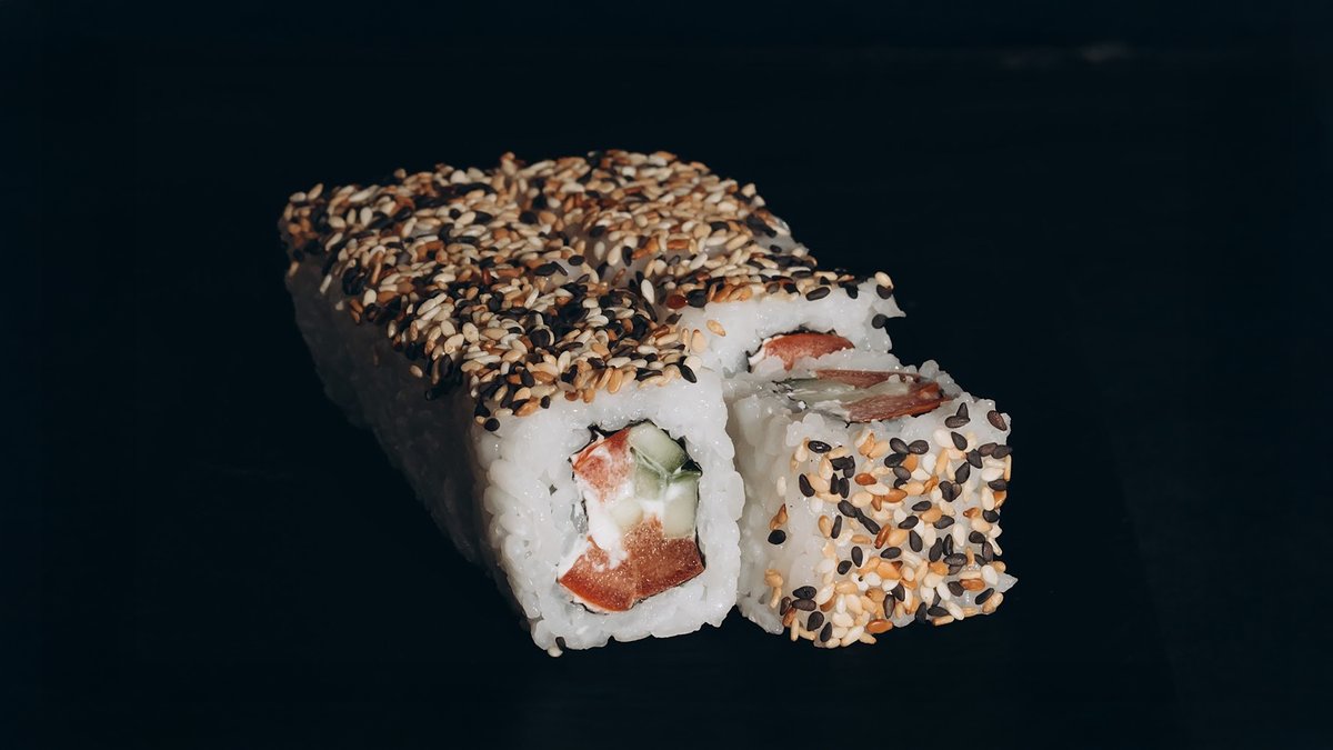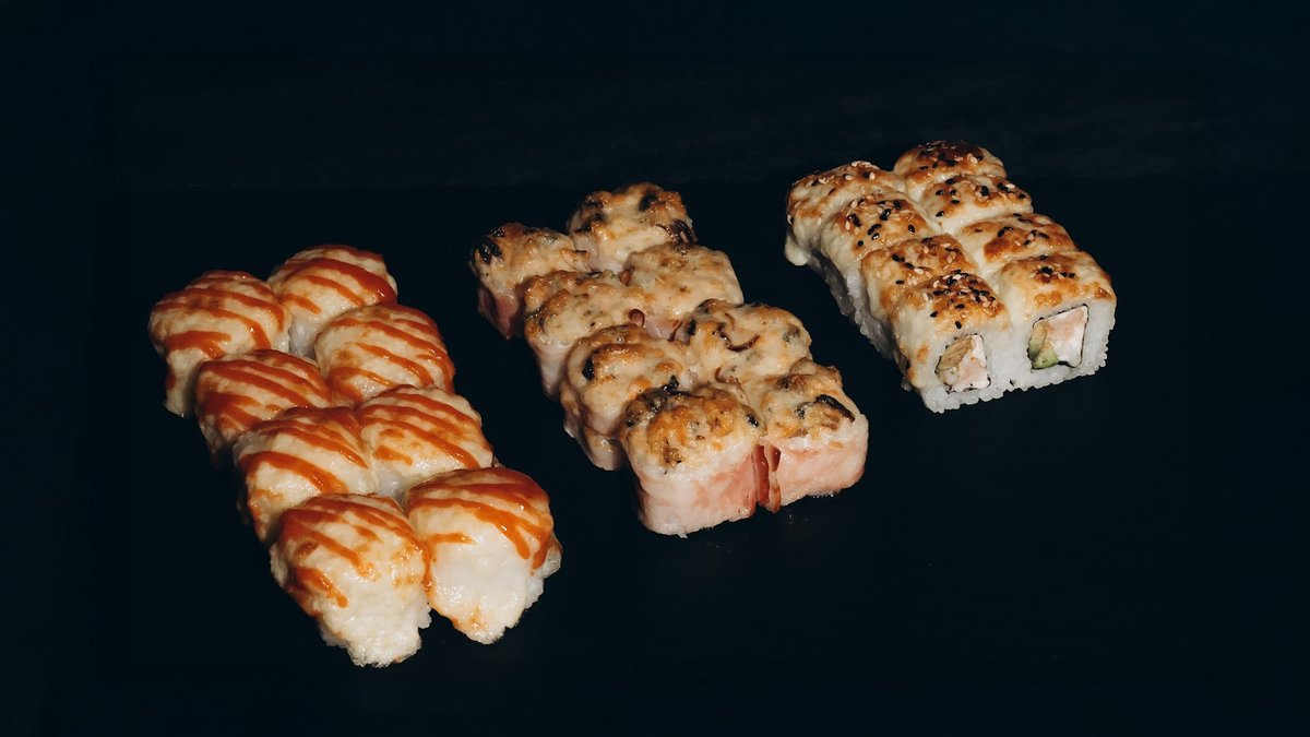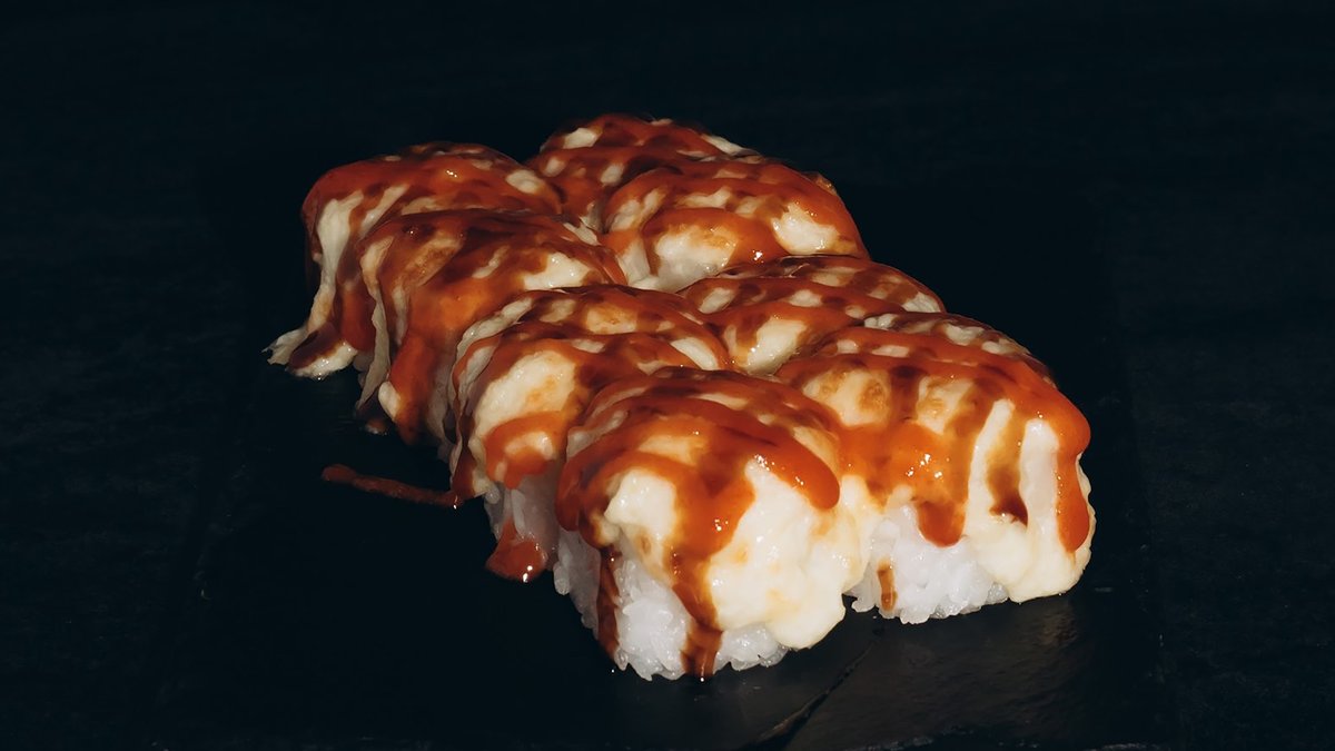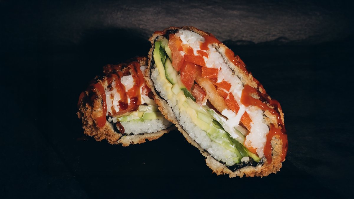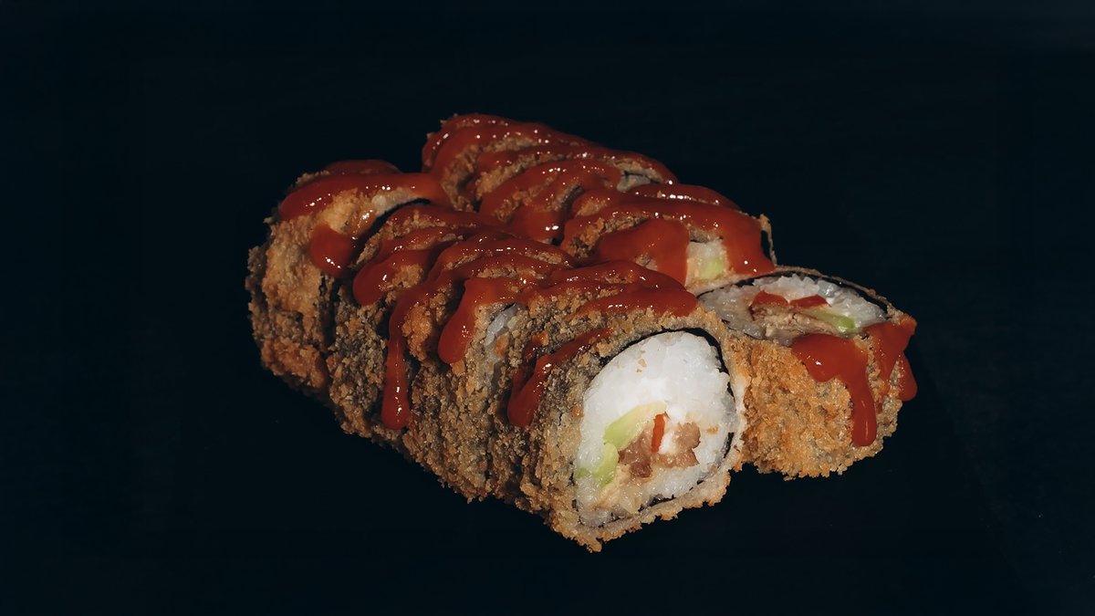 Rīsi, norī lapas, philadelphia, paprika, tomāti, gurķi, avokado, sīpolu gredzeni, tempura, teriyaki mērce, pikantā mērce.