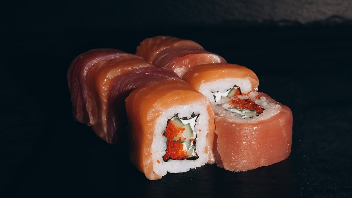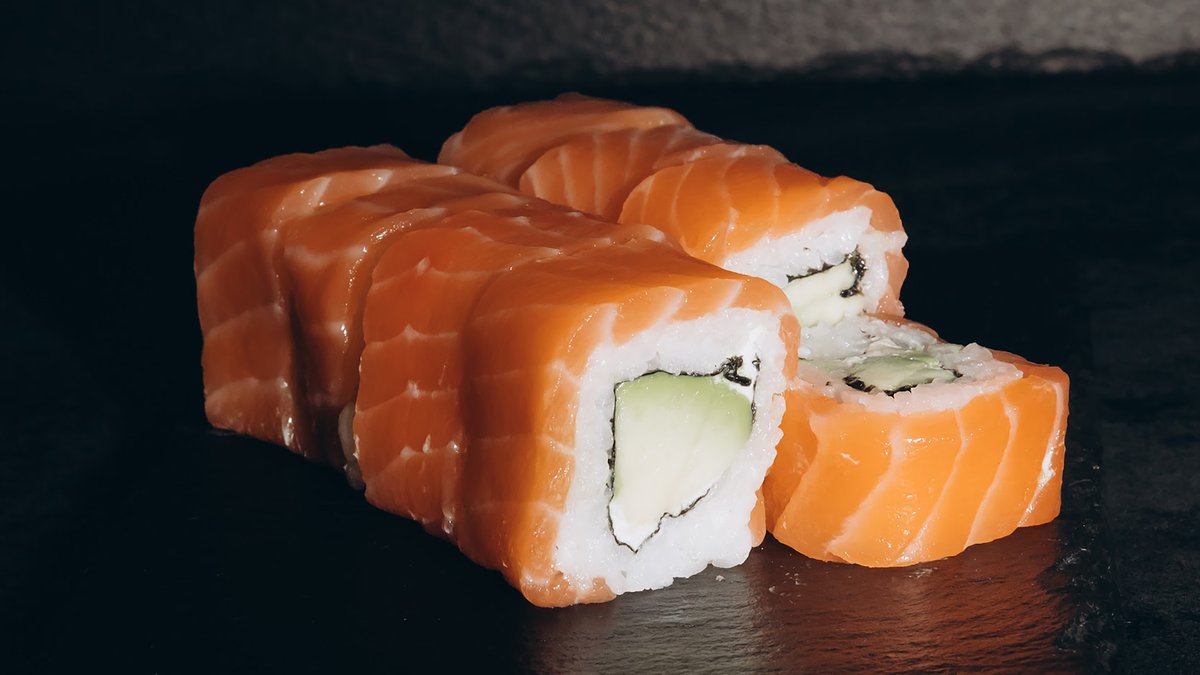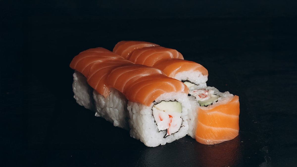 Rīsi, lasis, avokado, gurķi, philadelphia, teriyaki mērce, tempura.