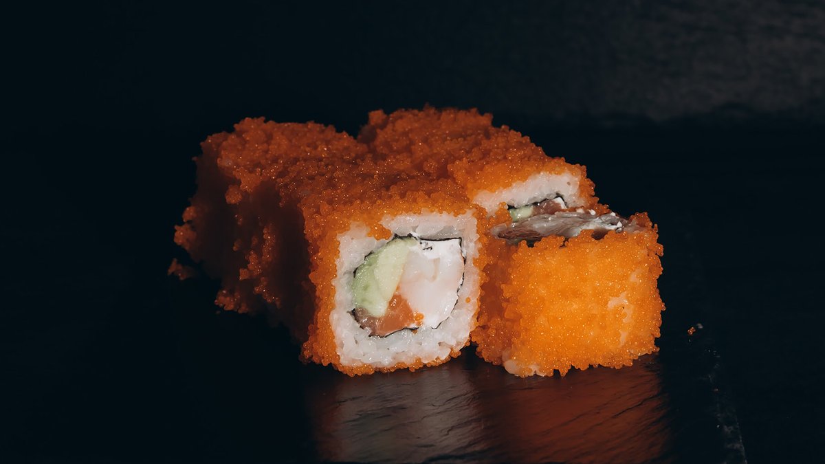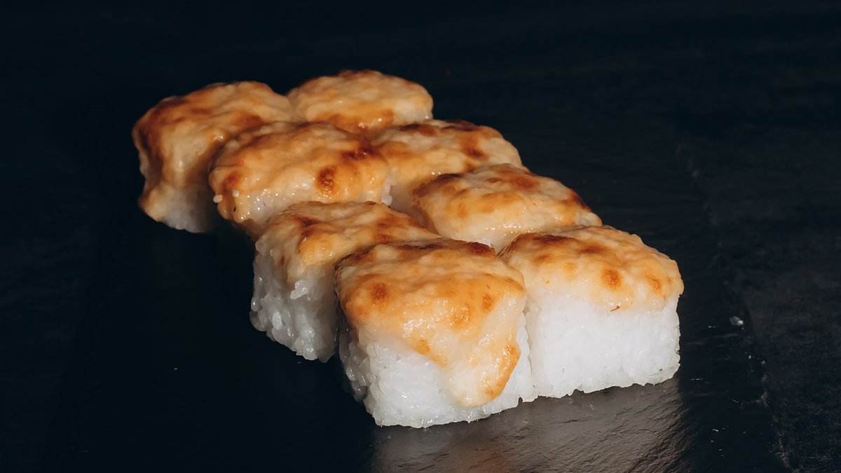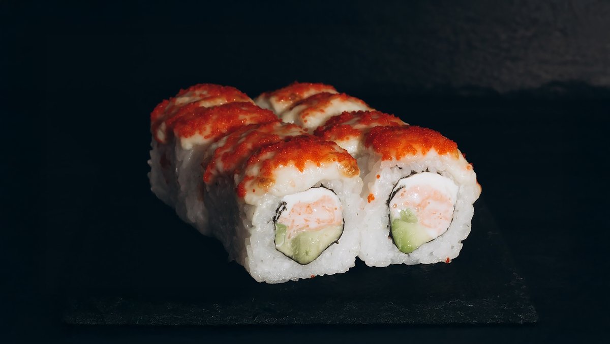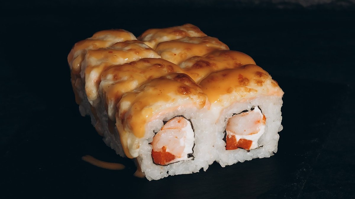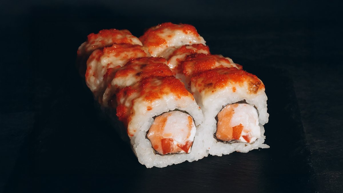 Rīsi, tīģergarneles, lasis, avokado, siera cepurīte, masago ikri, majonēze.