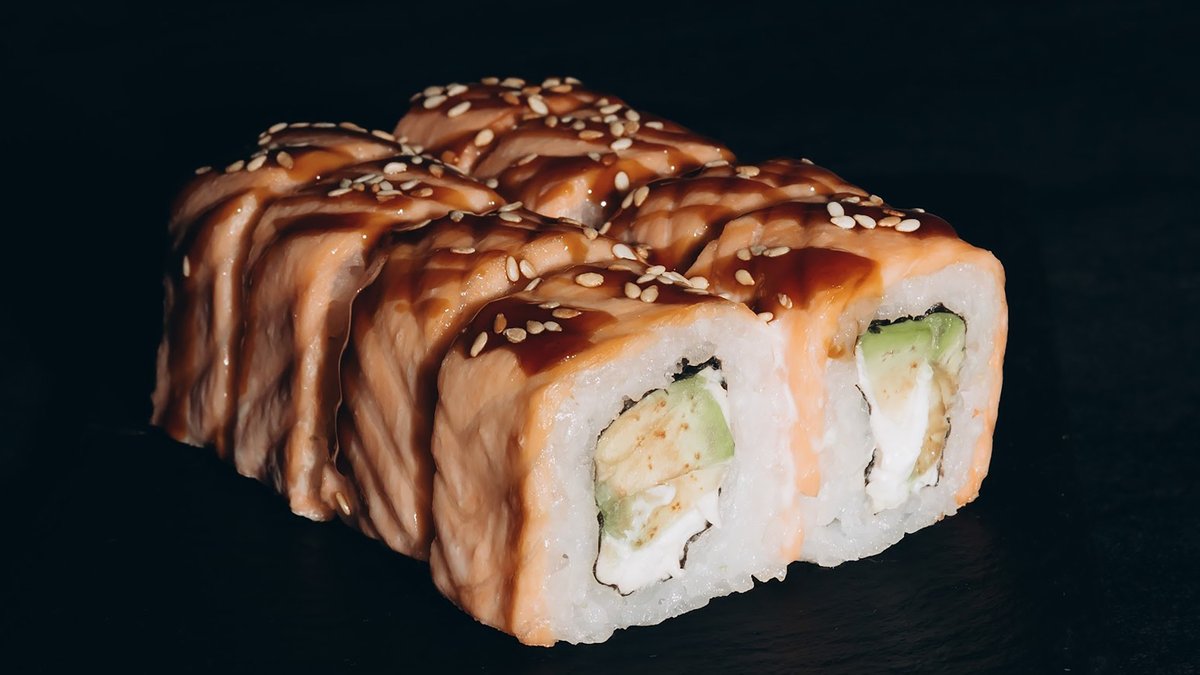 Rīsi, lasis, avokado, philadelphia, teriyaki mērce, sezams.