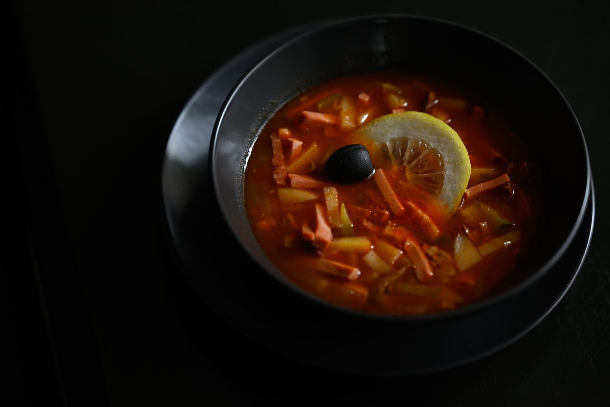 Soļanka, cūkgaļas karbonāde ar cepuri, kartupeļu biezenis, dārzeņi