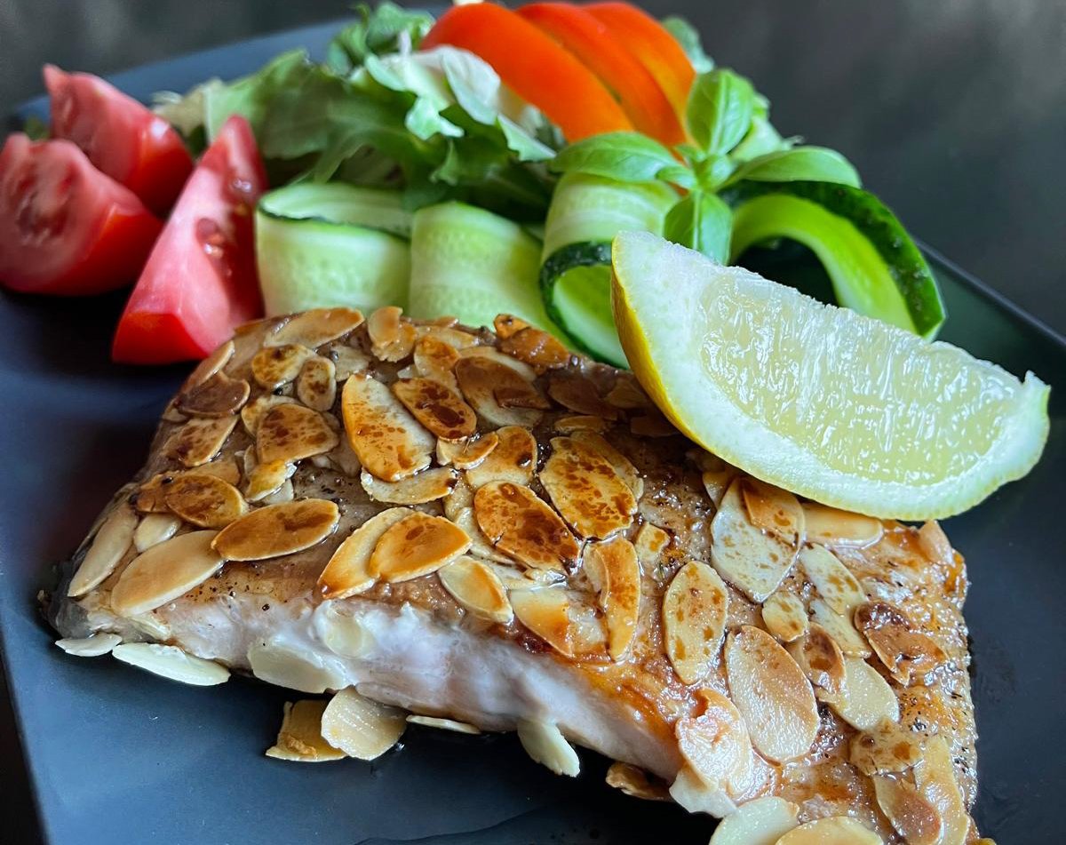 Salātlapas, vista grillēta, persiķi, dzērvenes, āboli, mandeles un medus-sinepju mērce