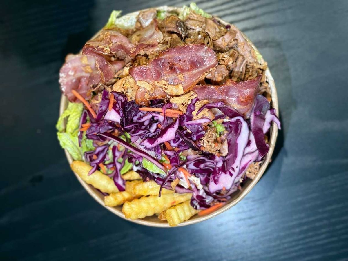 Frī ar plucinātu cūkgaļu, bekonu, kraukšķīgiem sīpoliem & WeKow mērci