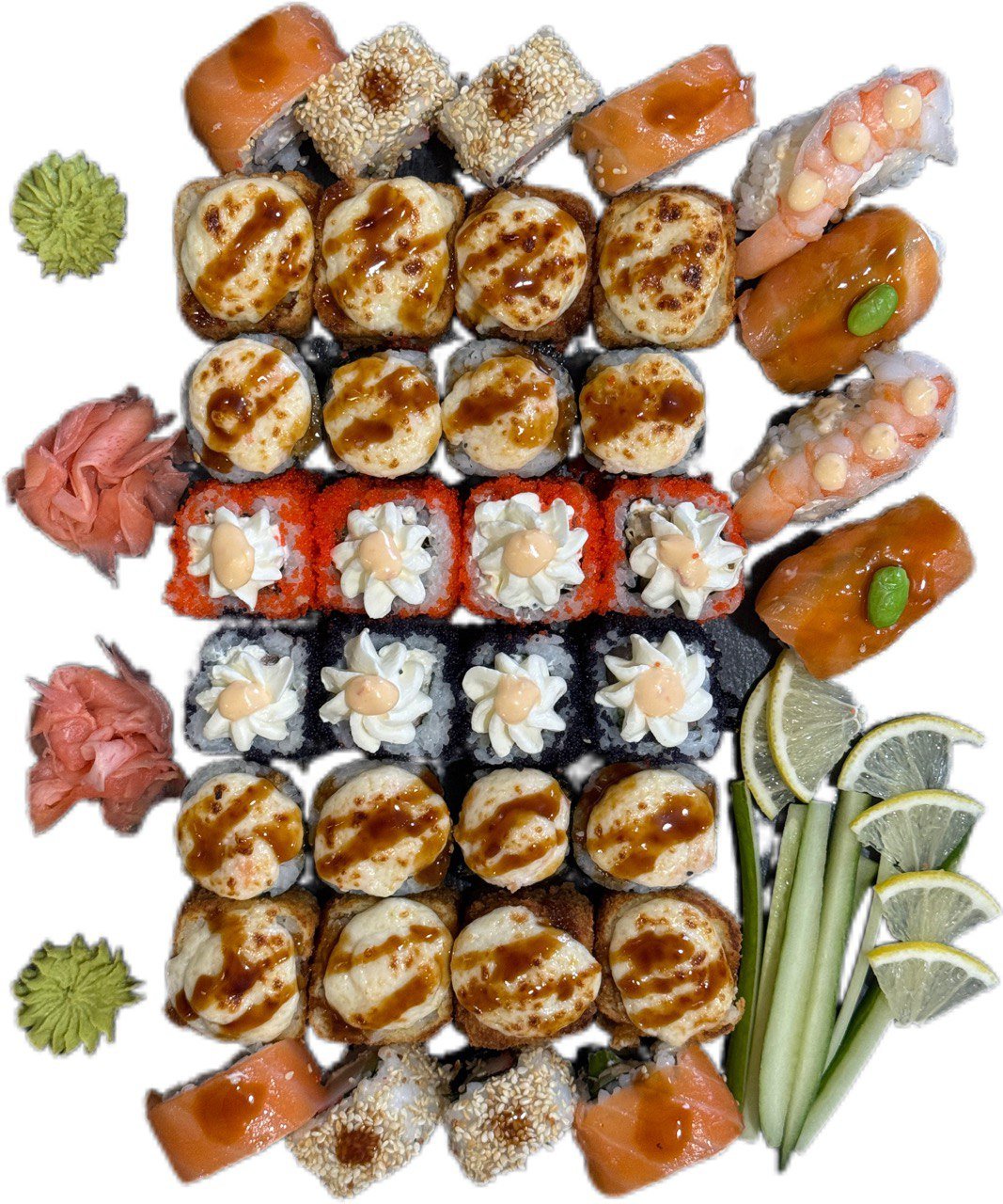(mazie), rīsi, nori, lasis, krēmsiers, asā mērce
