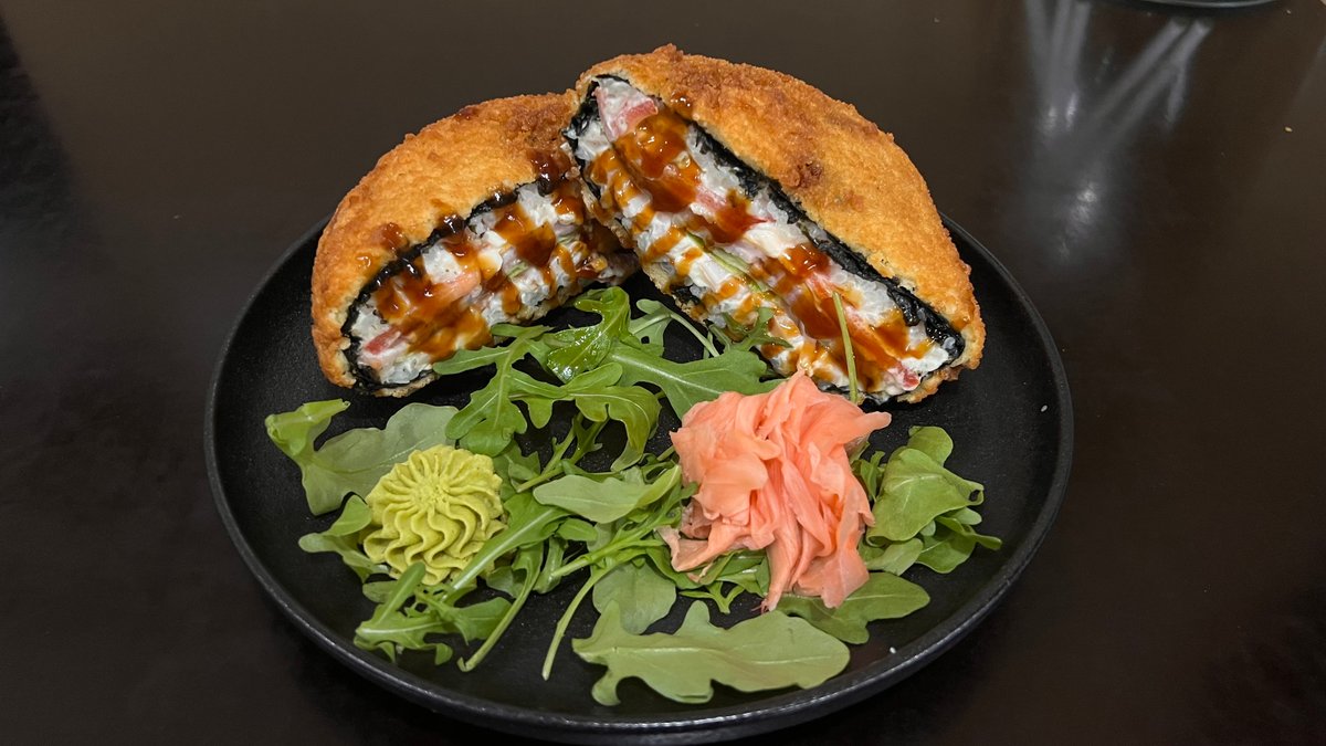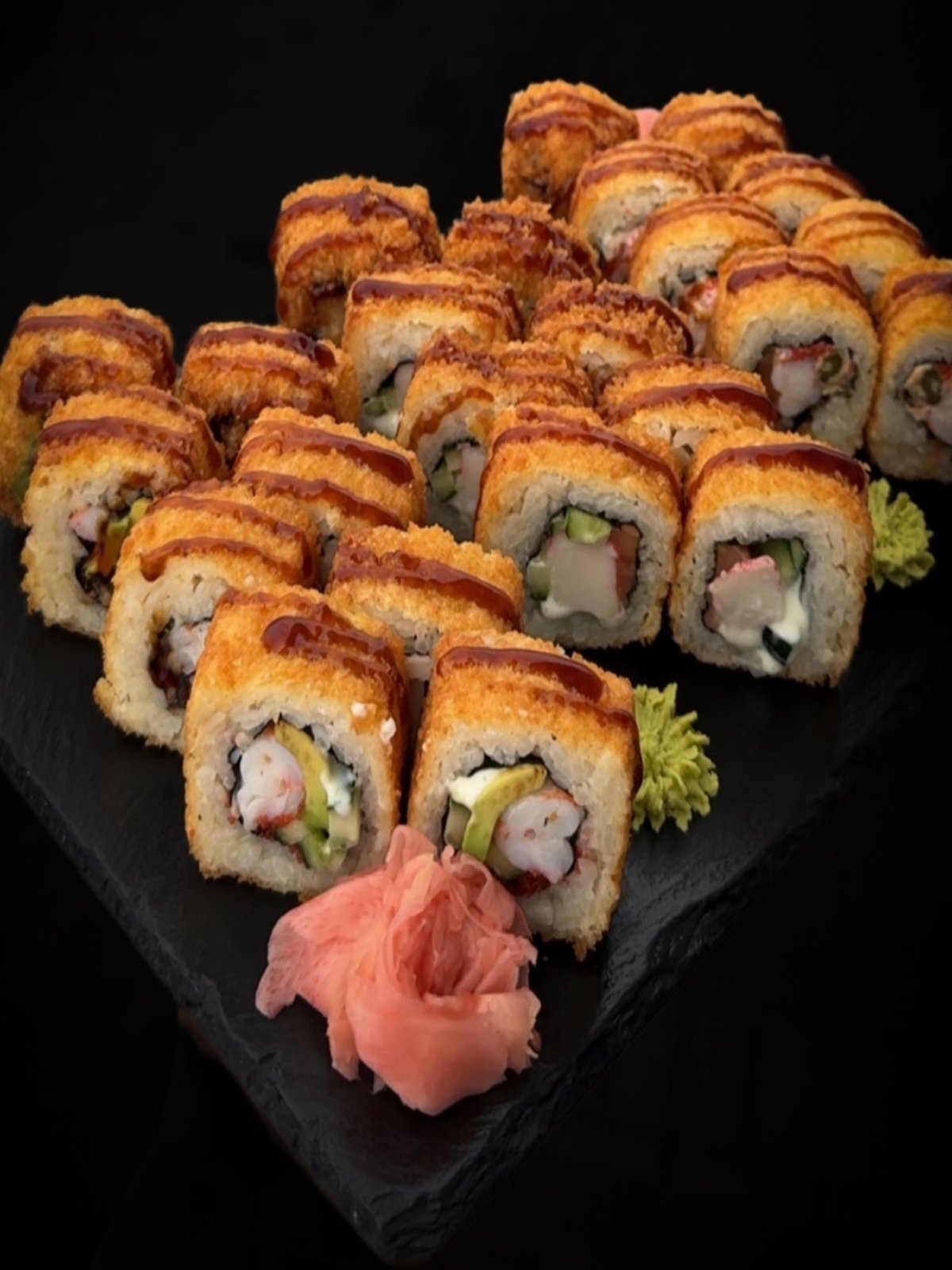 Rīsi, nori, krabju nūjiņas, tuncis, avokado, krēmsiers, asā mērce, tempura