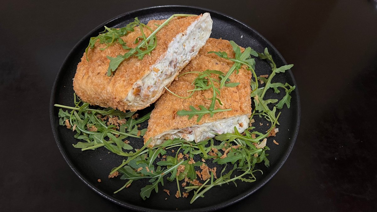 Sulīgā vistas fileja četru sieru, ar piedevām, dārzeņu salātiem un mērci