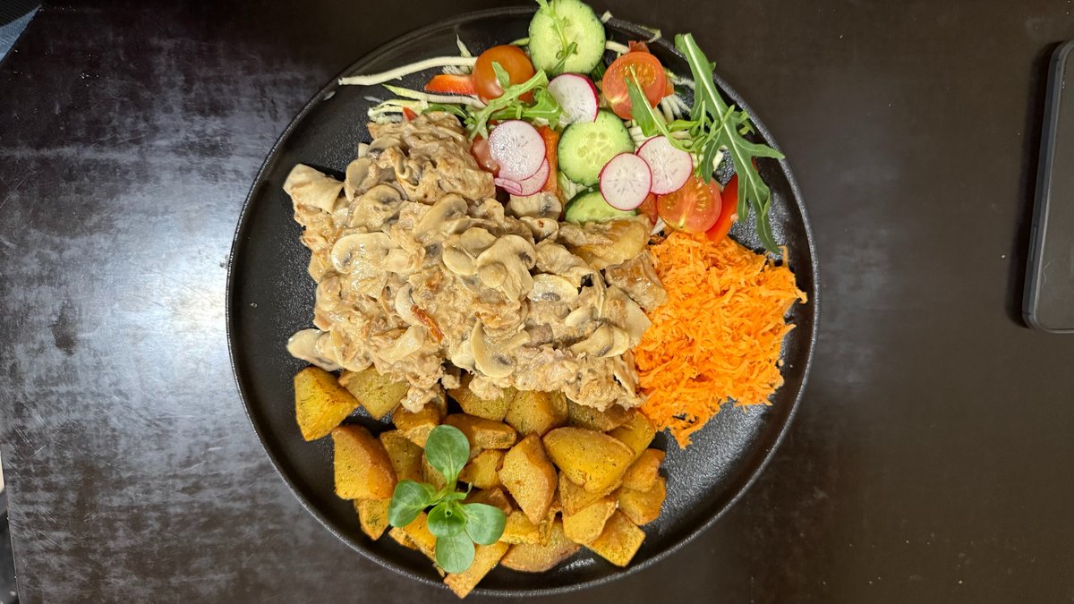 Cūkgaļa saldā krējuma mērcē ar šampinjoniem, apceptiem kartupeļiem un dārzeņu sa