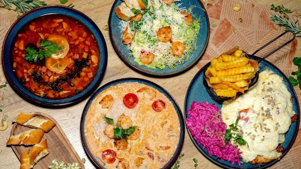 International cuisine menu, featuring a delightful range of options such as poke bowls, wok dishes, burgers, salads, potatoe pacakes.