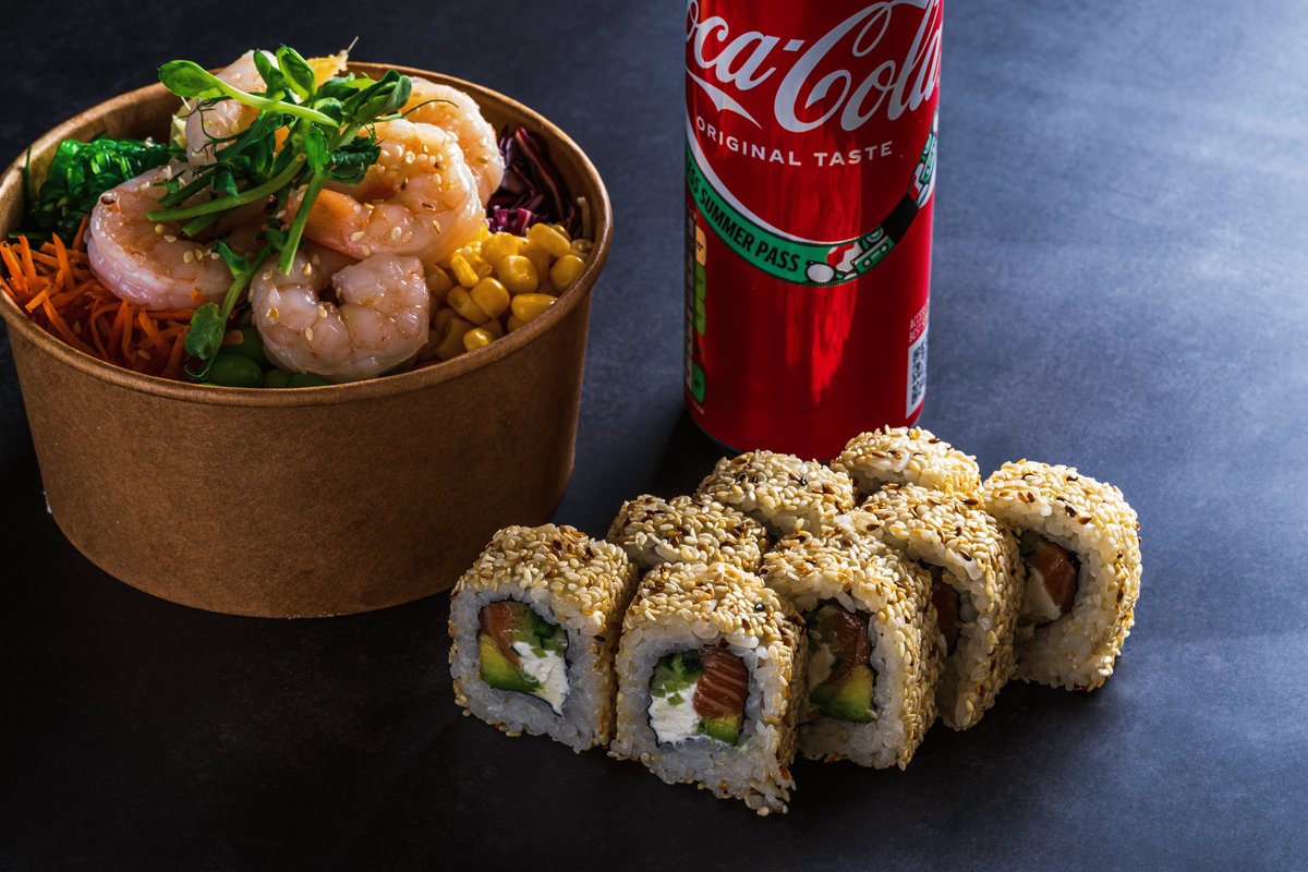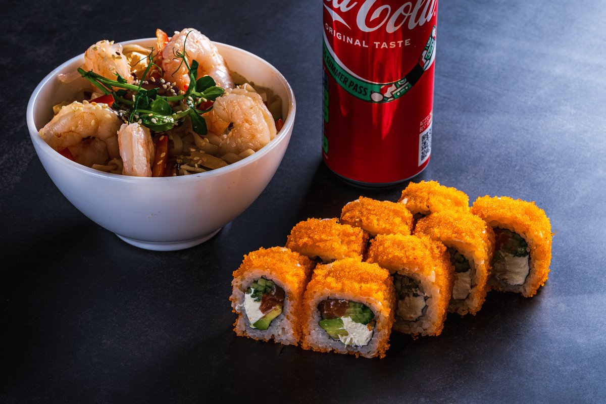 Pokijs M ar tīgergarnelēm + 115/2. Philadelphia Sesame (8.gab.) + Coca-Cola 0.2l