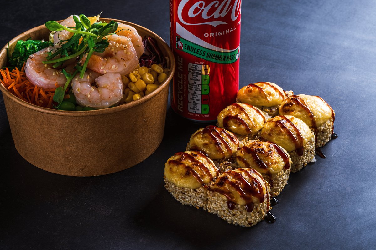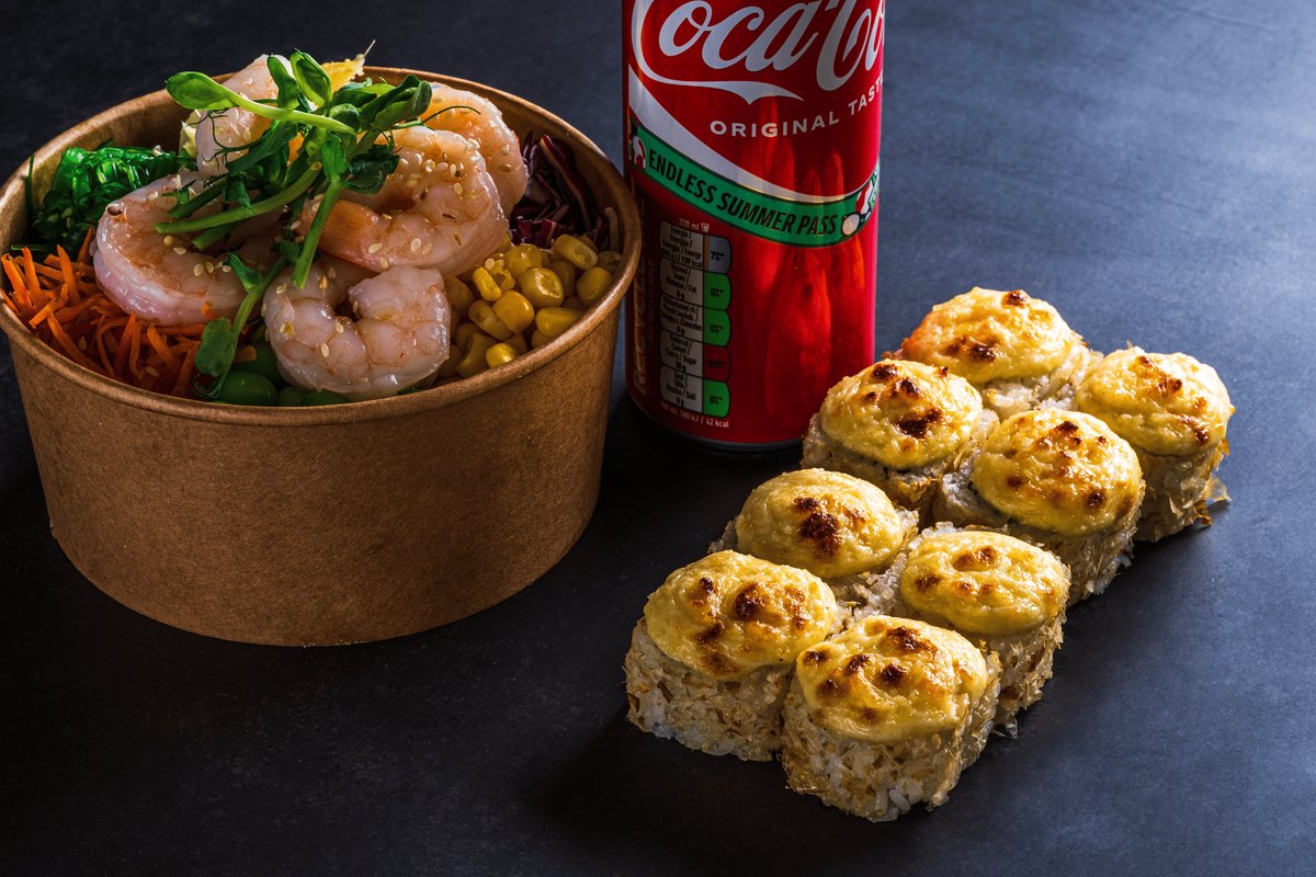 Rīsi, tīgergarnelēs, wakame salāti, kāposti, ingvers, edamame sojās pupiņas, burkāni, konservētā kukurūza. Produkts var saturēt: soju, zivis, sinepes, sezamu. Rīsi, cepts LASIS, KRĒMSIERS, tomāti, , TUNČA pārslas, MAJONĒZE, SIERS. Komplektā ietilpst: viena SOJAS MĒRCE, wasabi un ingvers.