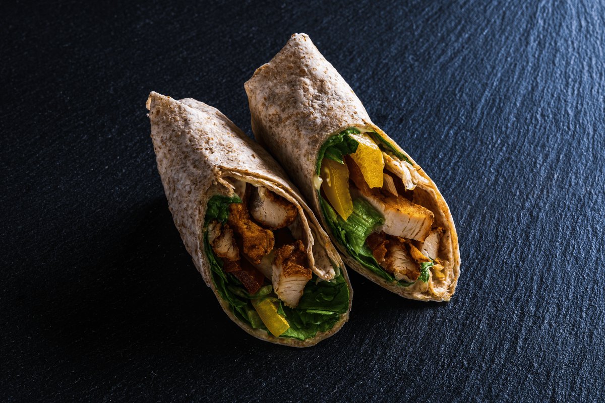 KVIEŠU TORTILA, vistas fileja, MAJONĒZE, Iceberg salāti, tomāti, paprika.