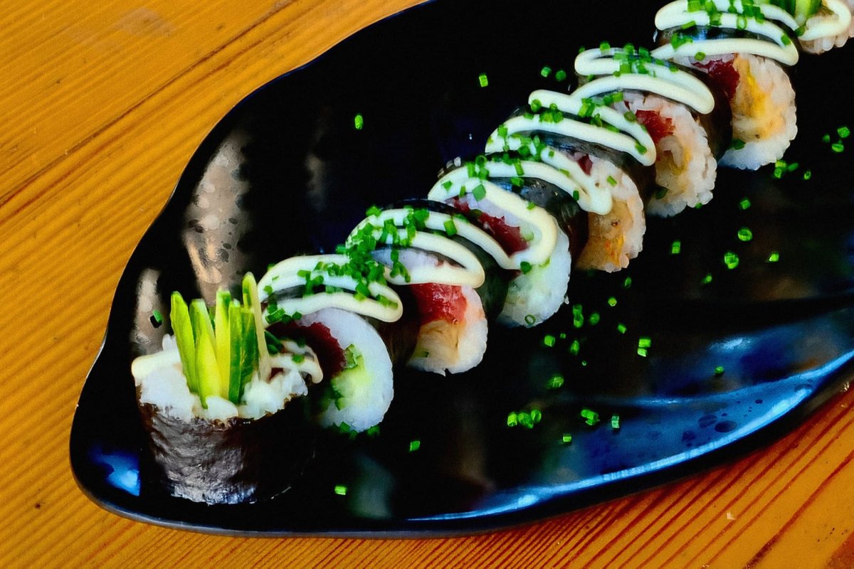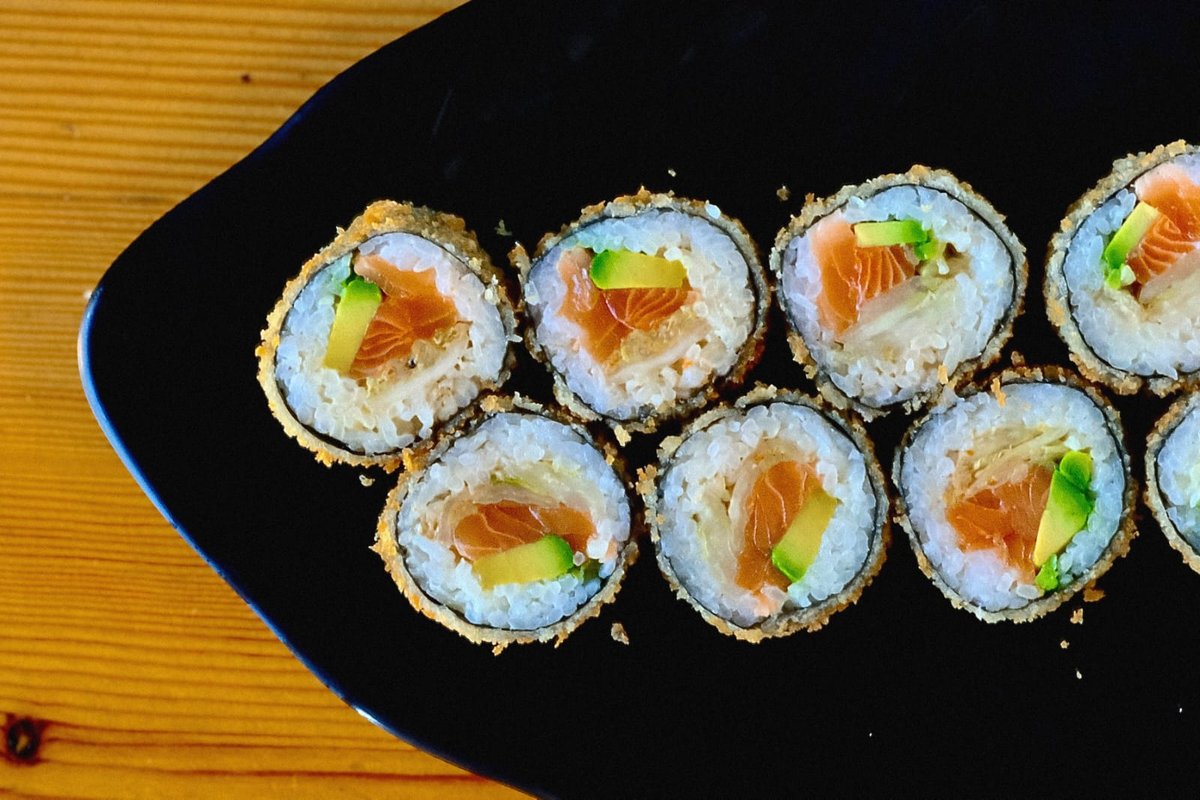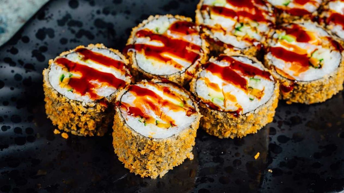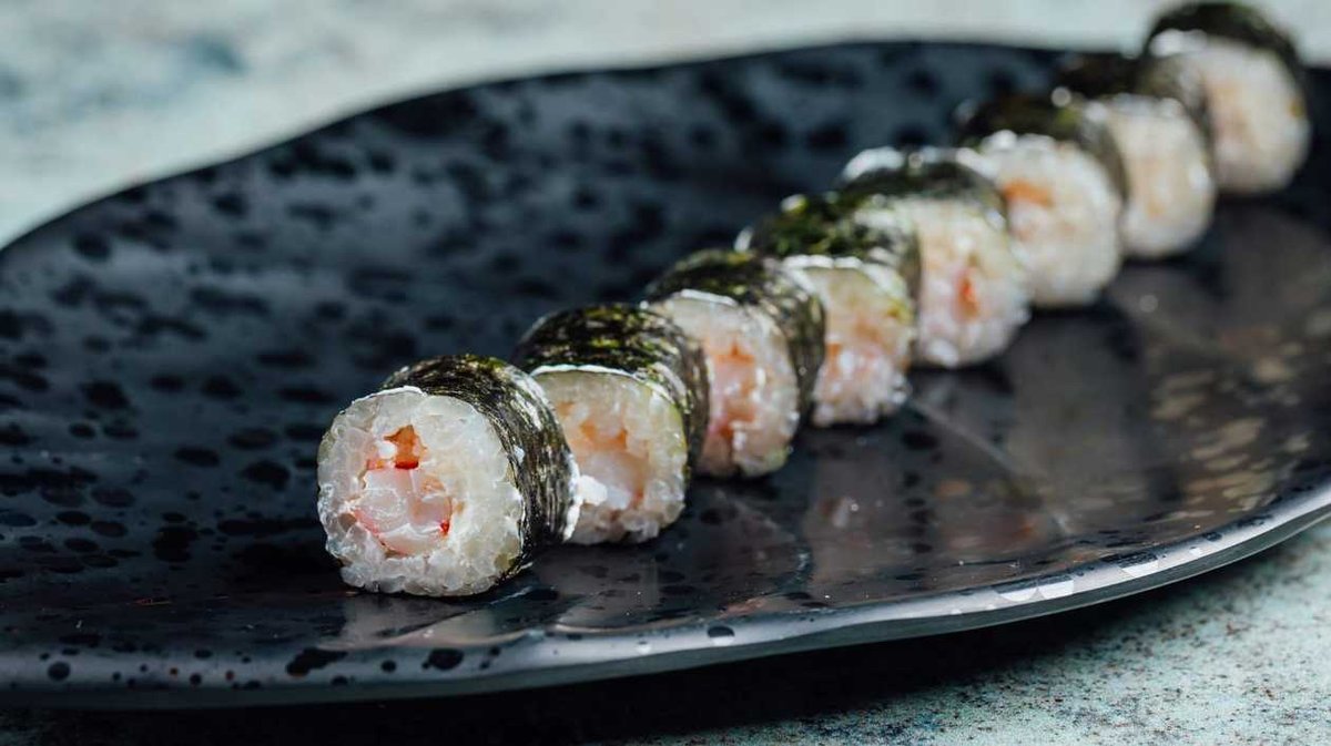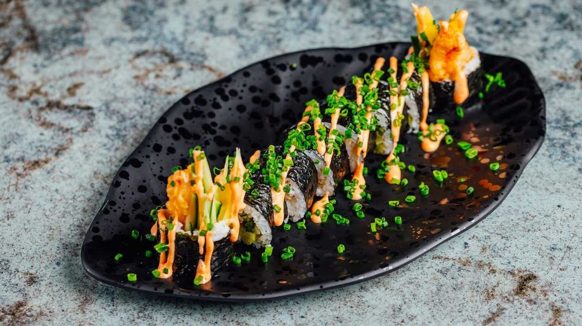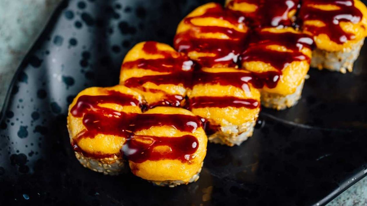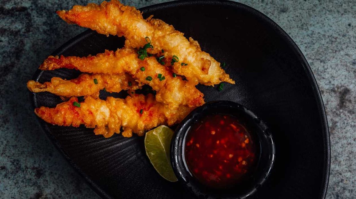 Garneles tempurā, takuan redīsi, gurķis, spicy mērce, maurloki
