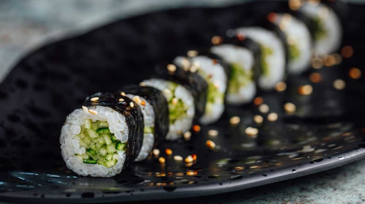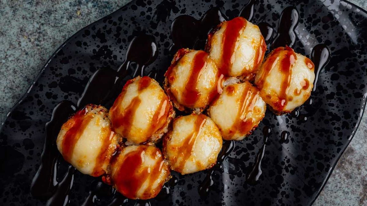 Paprika, gurķis, takuan redīsi, krēmsiers, sezama sēklas, unagi mērce, siera cepurīte