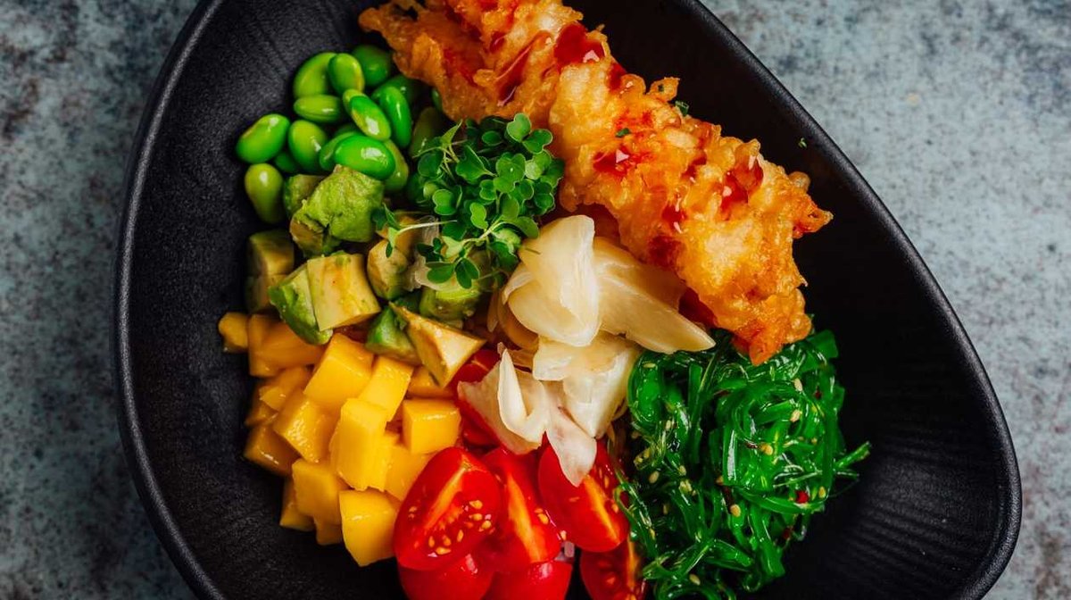 Rīsi, garneles, teriyaki mērce, avokado, wakame, mango, edamame, ķiršu tomāti, marinēts ingvers
