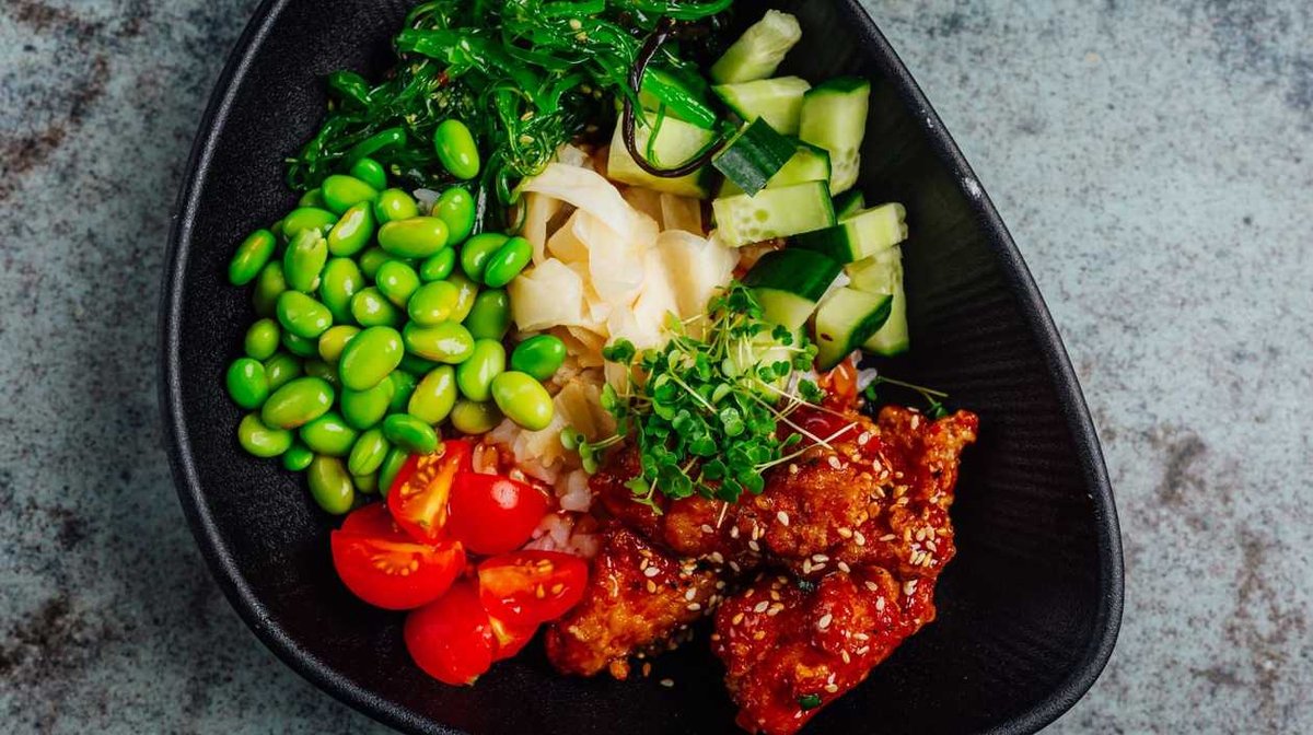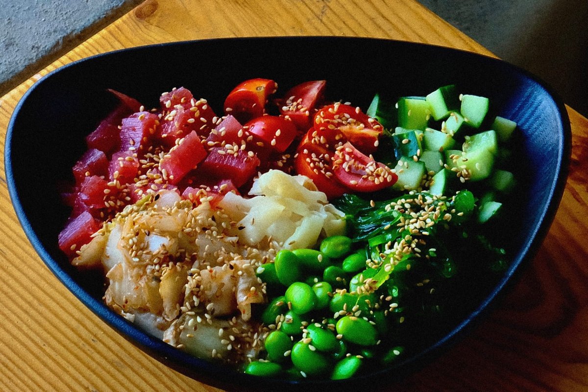 Rīsi, tuncis, gurķis, wakame, ķiršu tomāti, edamame, kimči, teriyaki mērce, sezams