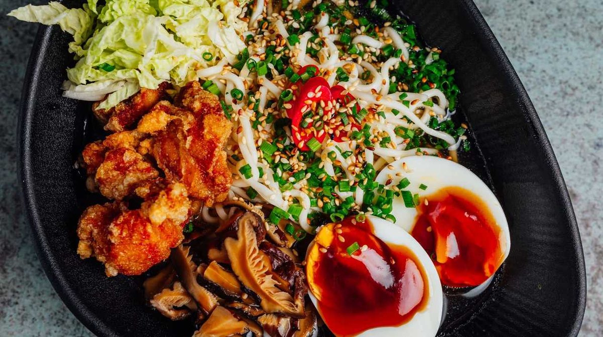 Ola, pak choi salāti, olu nūdeles, šitaki sēnes, čili pipars, sezama sēklas, maurloki, teriyaki mērce, vistas gaļa