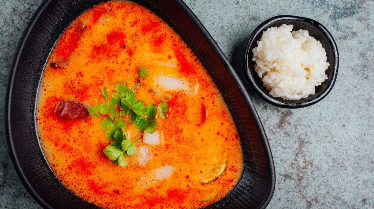 Rīsi, ķiršu tomāti, šampinjoni, vistas gaļa, kokosa piens, laims