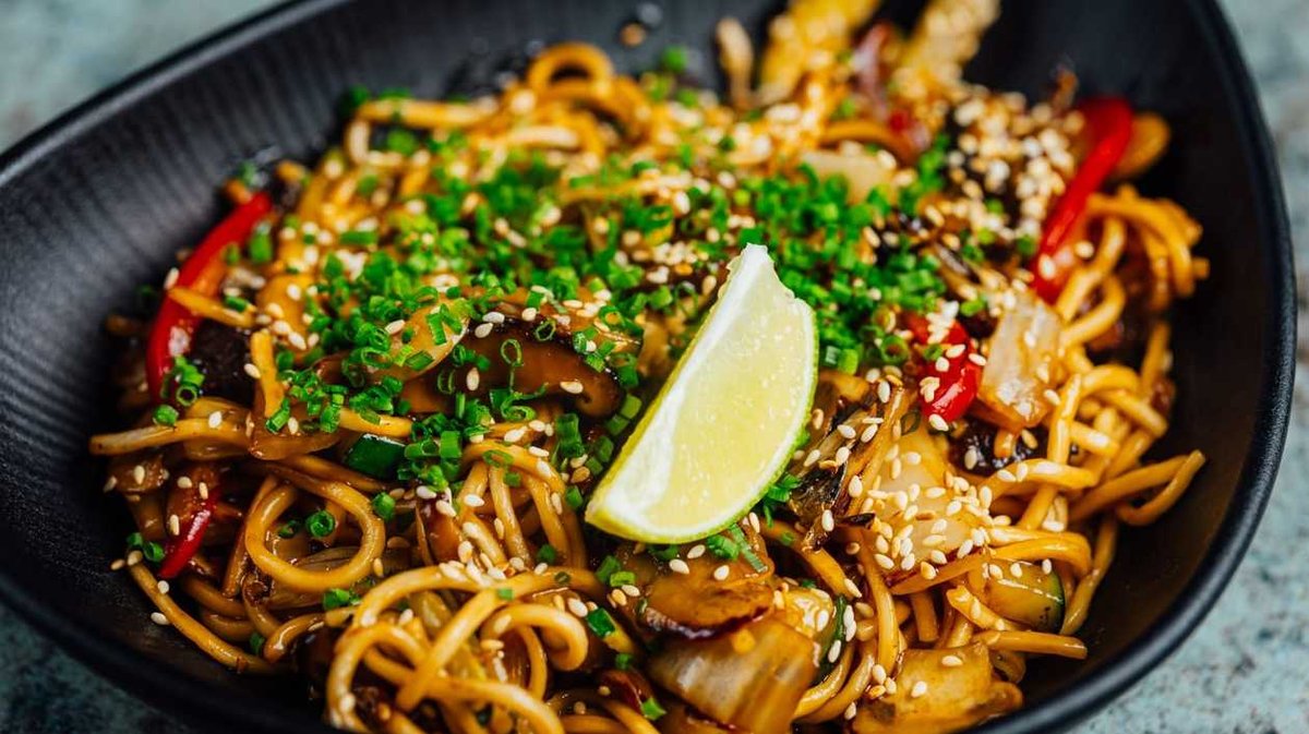 Dārzeņu mix, olu nūdeles, teriyaki mērce, sezams, maurloki, laims