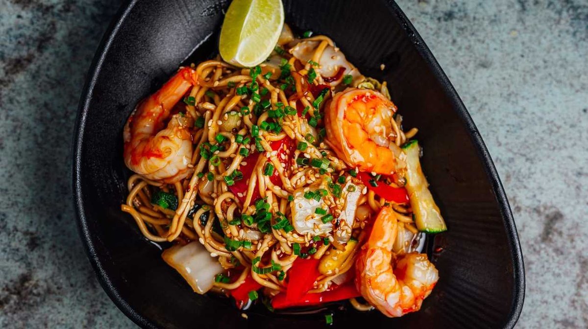 Dārzeņu mix, teriyaki mērce, olu nūdeles, garneles, sezama sēklas, maurloki, laims