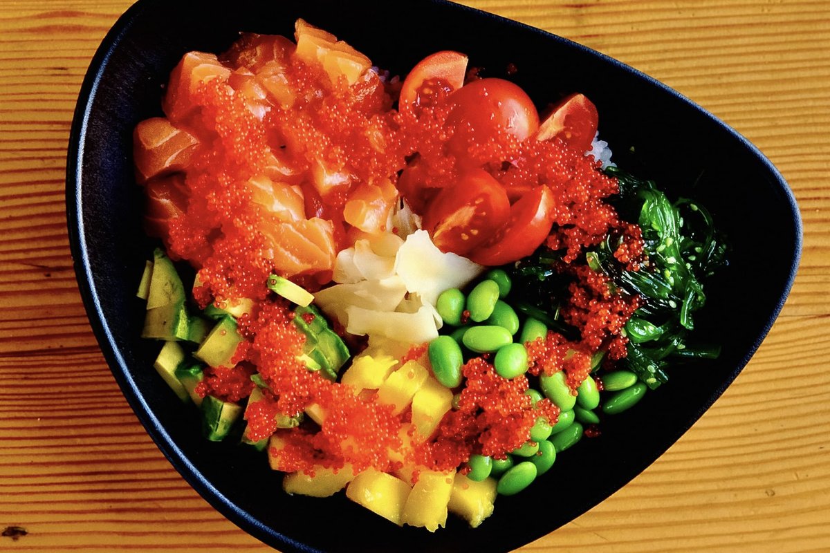 Rīsi, lasis, avokado, mango, ķiršu tomāti, wakame, edamame, tobiko, teriyaki mērce
