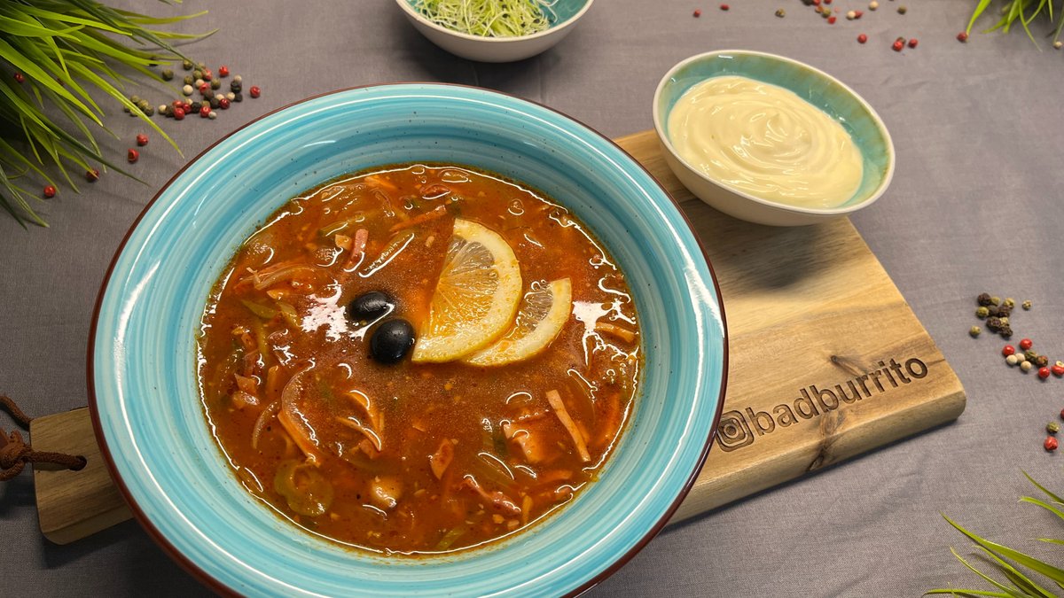 Gaļa, kūpinājumi, burkāni, marinēti gurķi, sīpoli, olīvas, tomātu pasta, garšvielas, krējums.
