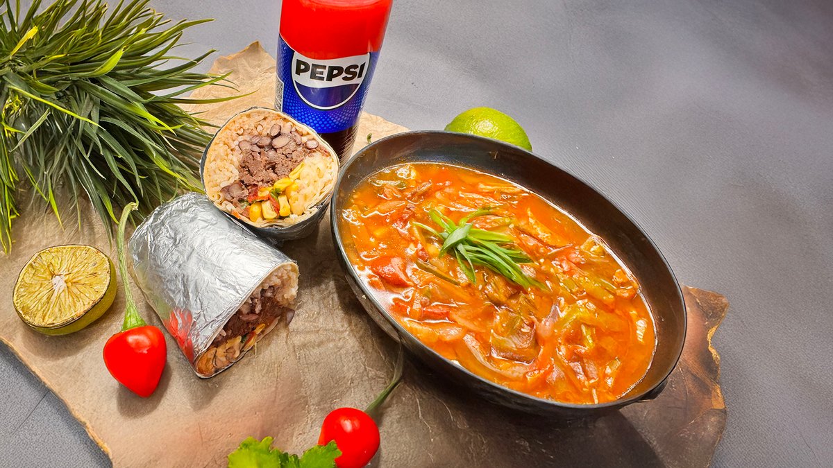Burrito ar plucinātu cūkgaļu, rīsi, melnās pupiņas, siers, kukurūzas salsa, tomātu salsa, skābais krējums, tortilija, salāti, sipoli. Sastāvdaļas nav iepējams izņemt.