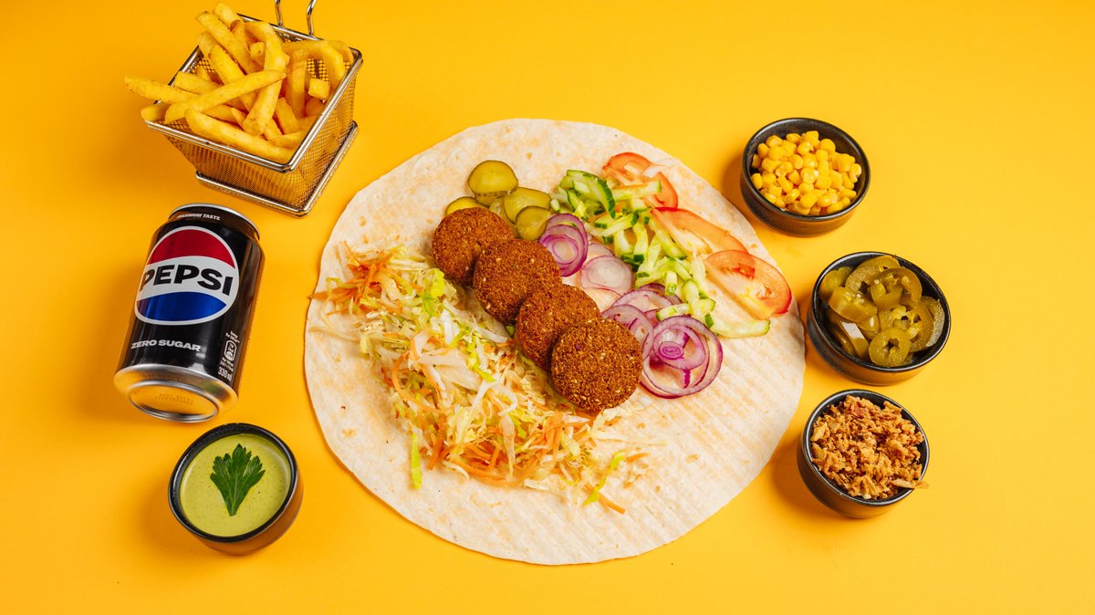 🔥 Kraukšķīgas, zeltainas falafela bumbiņas, svaigi salāti un tava izvēlētā gardā mērce, viss ietīts maigā, siltā tortiljā!