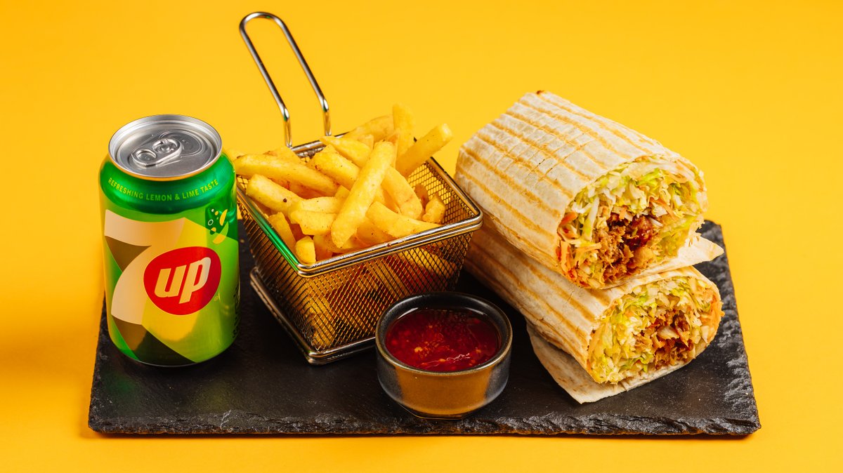 Grilēts vistas un liellopa kebabs ar kraukšķīgiem frī kartupeļiem un atspirdzinošu 330 ml dzērienu