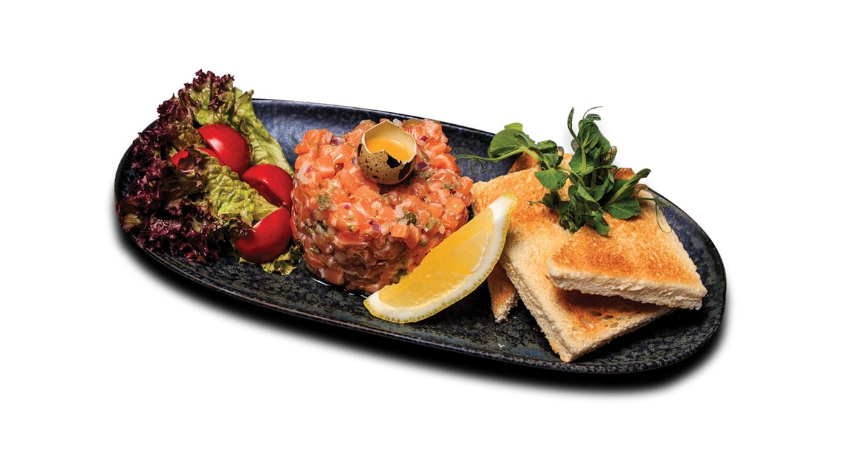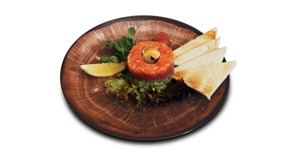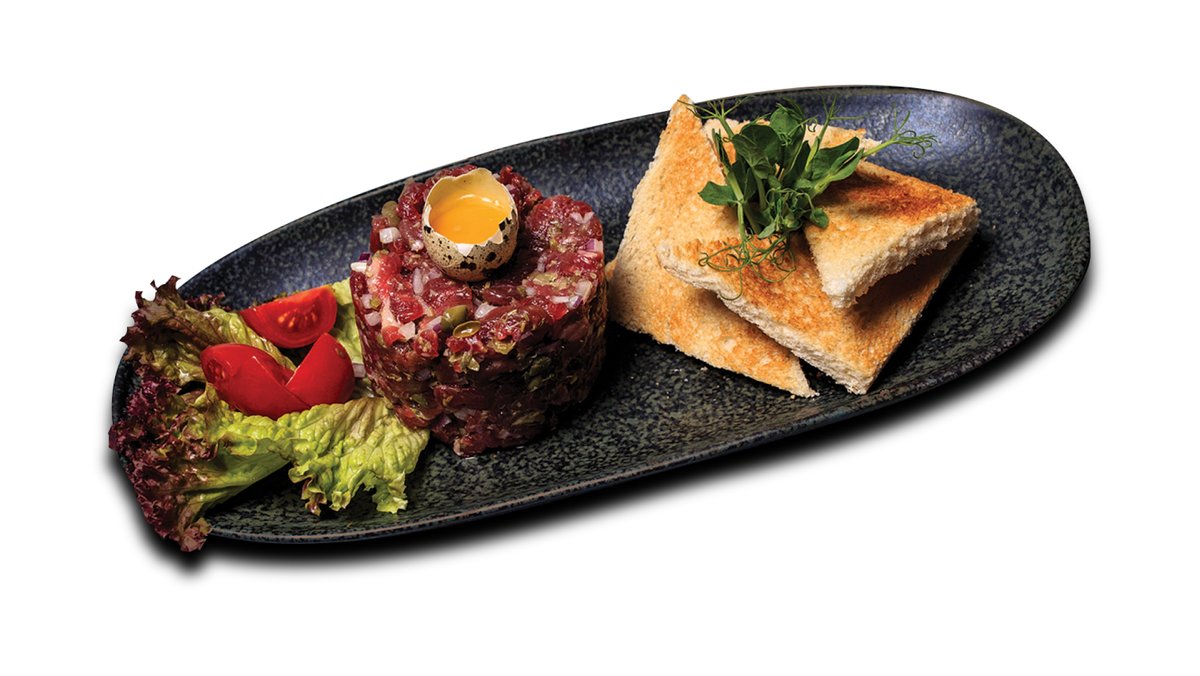 Liellopu fileja, sarkanais sīpols, kaperi, paipalu olas, tostermaize