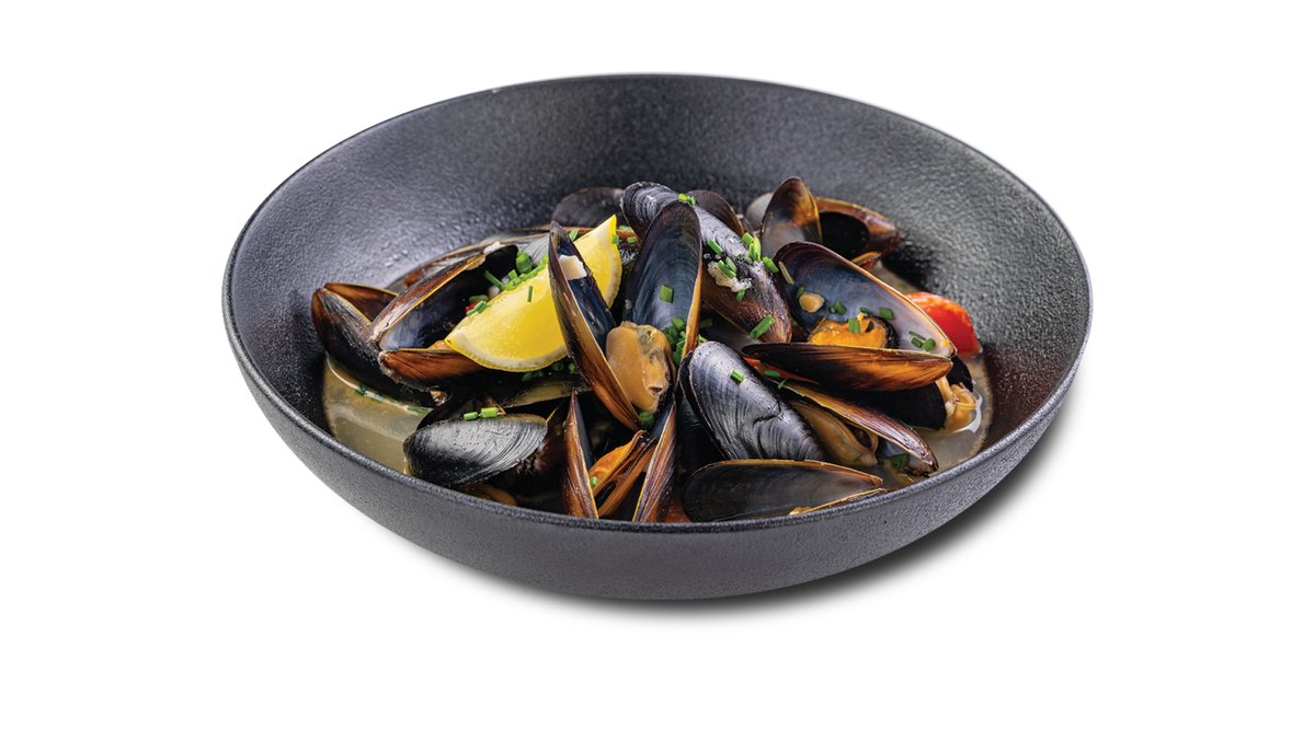 Mīdijas, ķiploks, baltvīns, ķiršu tomāti.
