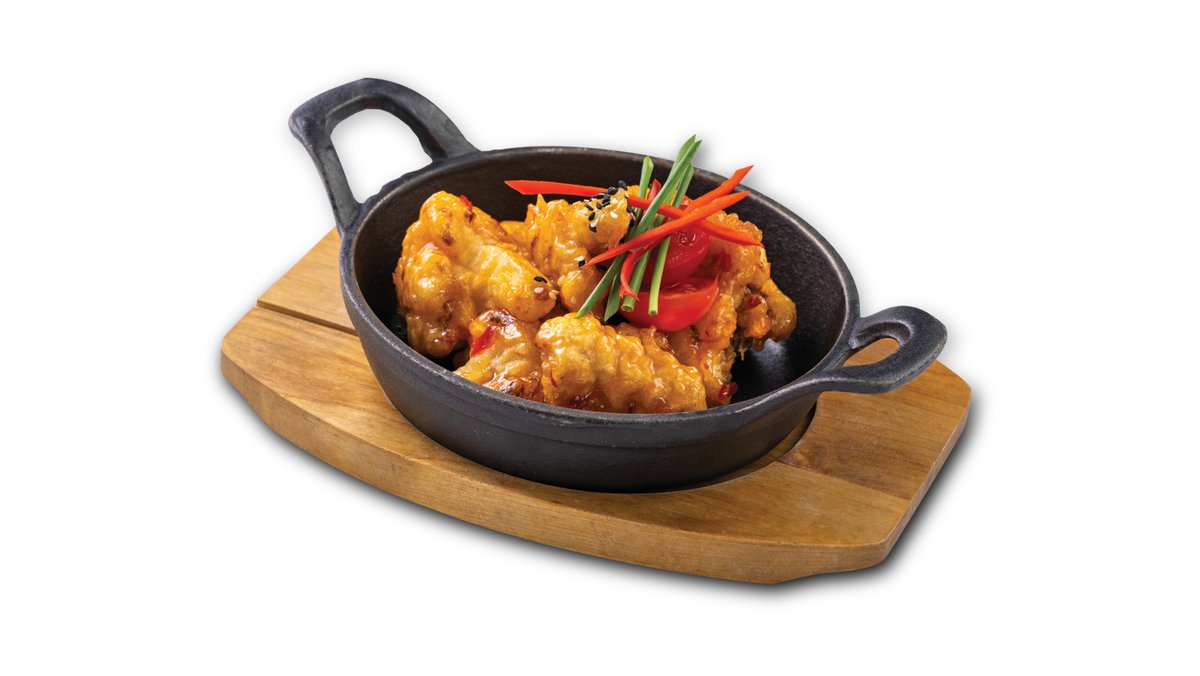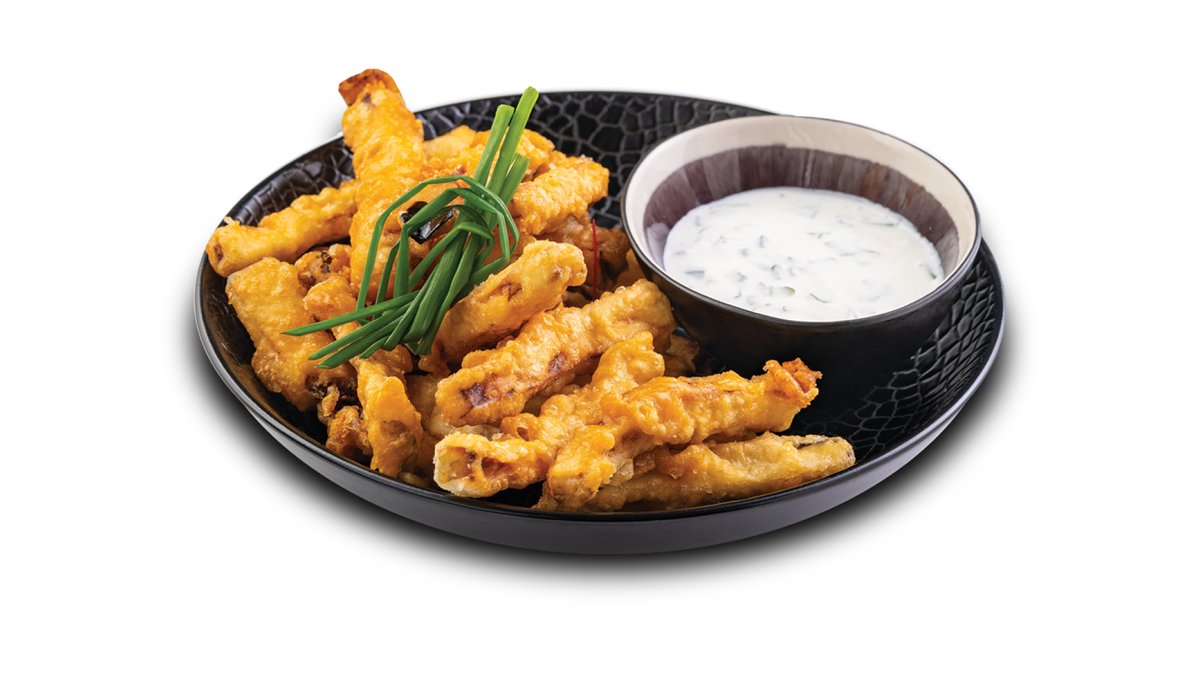Tīģergarneles tempurā; Čedaras siers; Gurķis; Mango mērce; Čili pipari.
