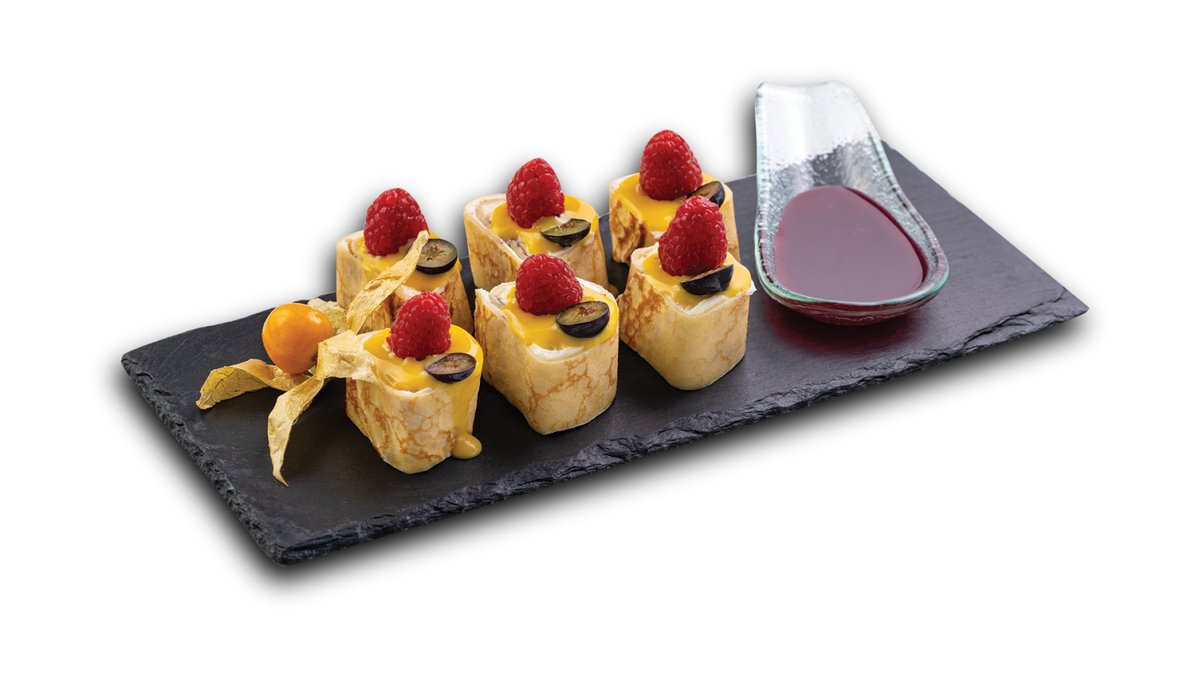 Saldais rols mango pankūkā ar augliem un ogām.