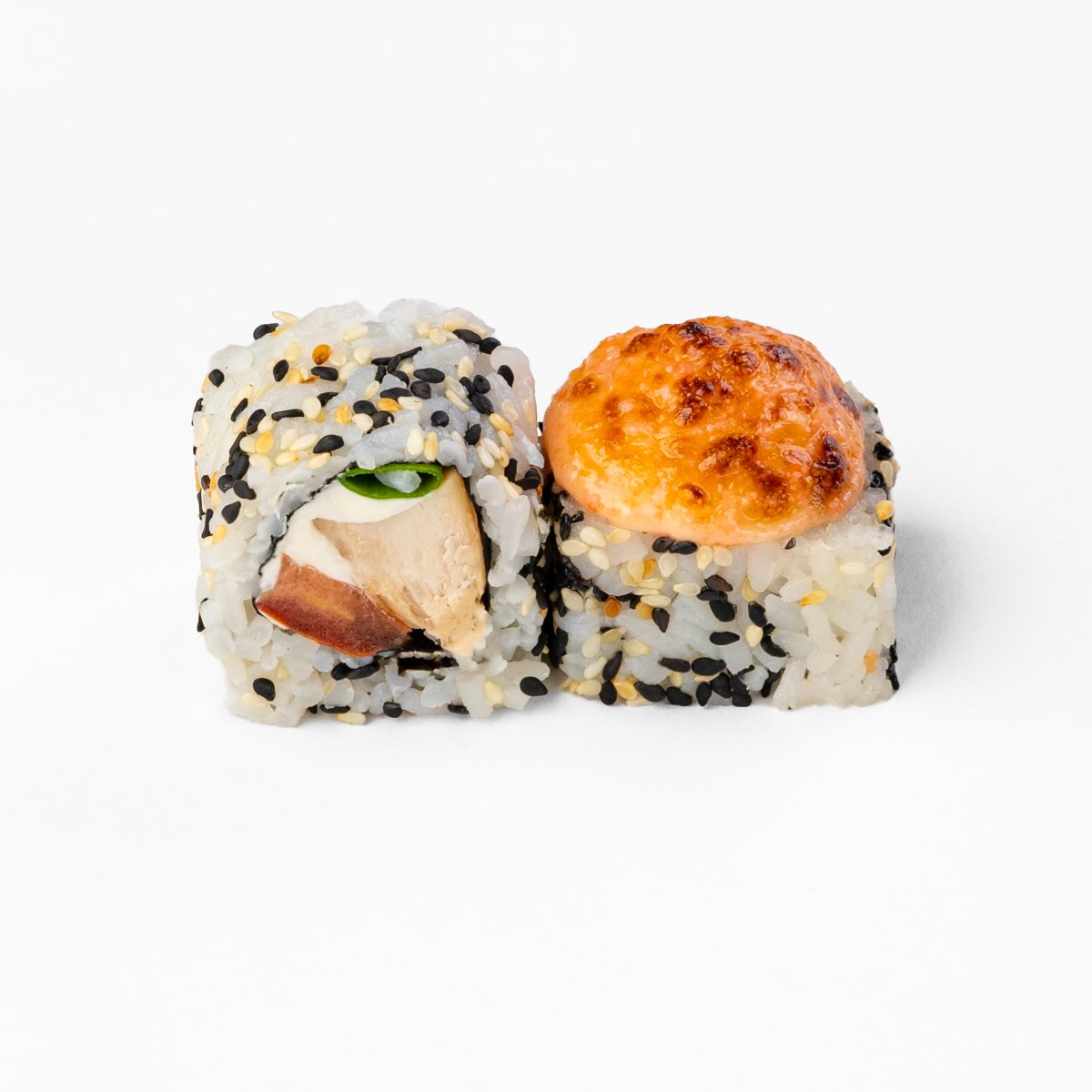 Bekons, gurķis, tomāts, cepts sīpols, philadelphia siers, masago ikri, pikantā mērce, unagi mērce