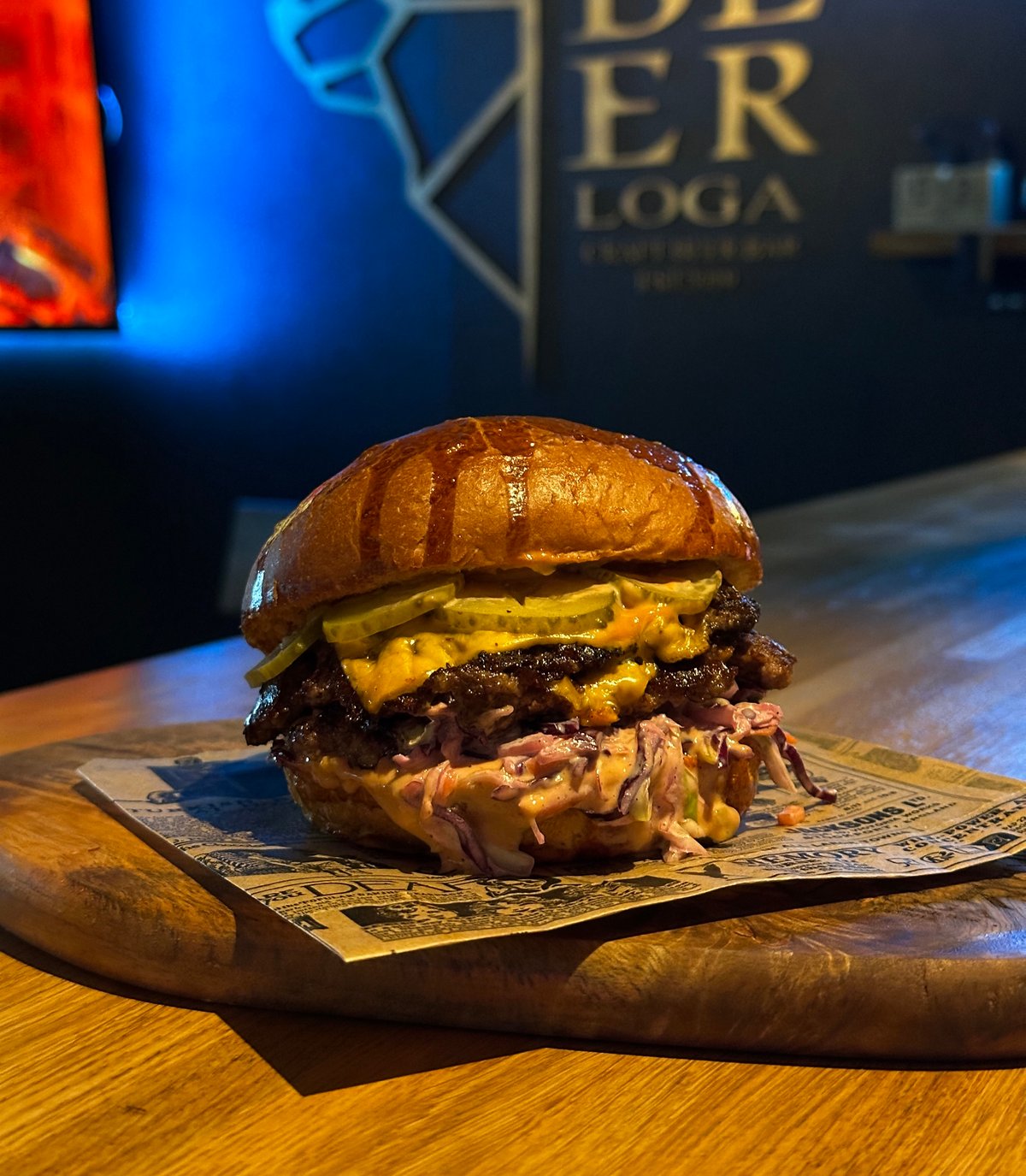 Sulaīgs burgers ar briošas maizīti, svaigiem coleslaw salātiem, īpašo Beerloga mērci, 3x liellopa kotletēm, 3x čederas siera porciju, marinētiem gurķīšiem un kraukšķīgiem ceptiem sīpoliem.