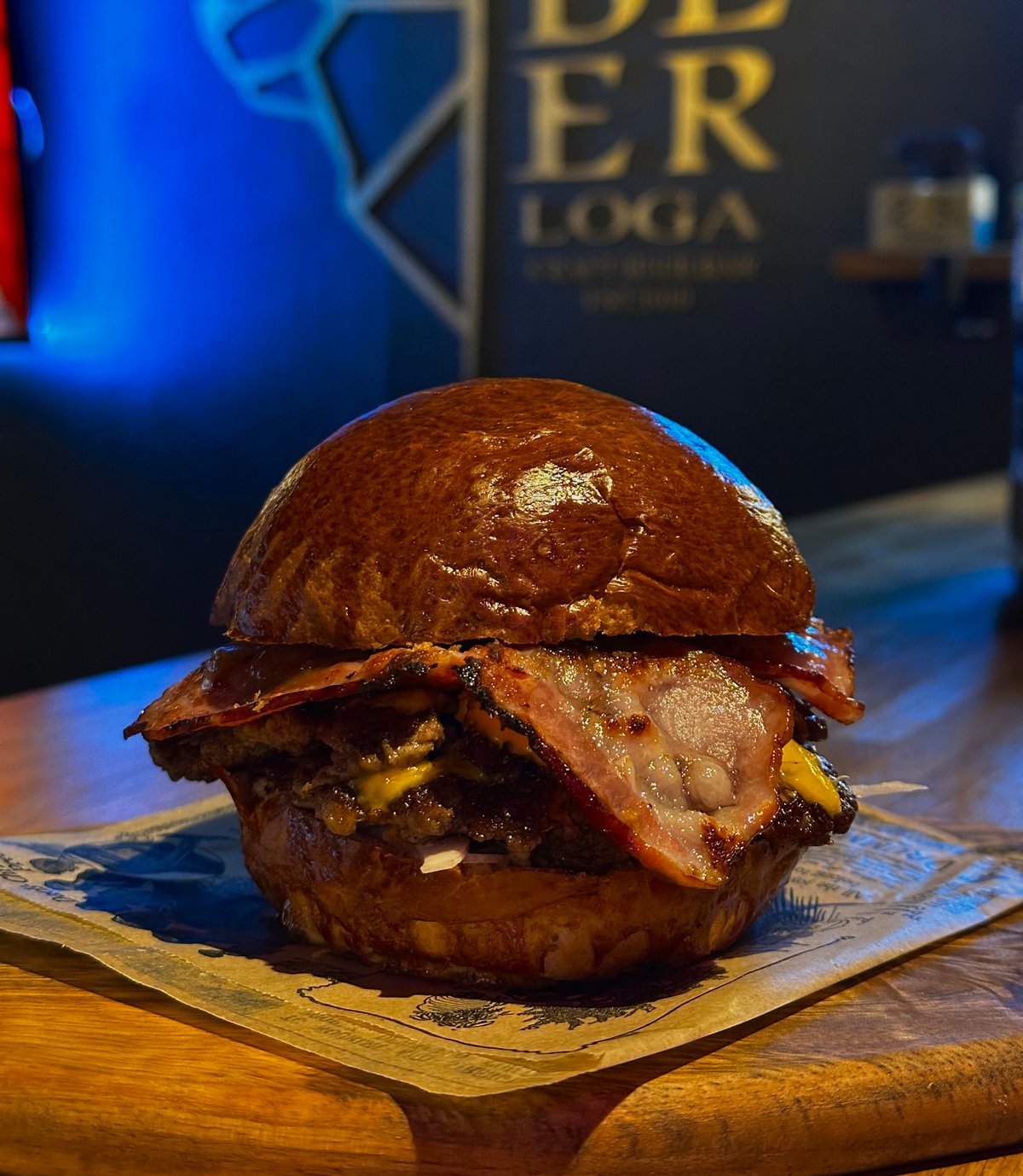 Sulaīgs burgers ar briošas maizīti, svaigiem coleslaw salātiem, īpašo Beerloga mērci, divām liellopa kotletēm, dubultu čederas siera porciju, kraukšķīgiem ceptiem sīpoliem, marinētiem gurķīšiem, sulīgu bekonu un aromātisku karamelizēta sīpola mērci.