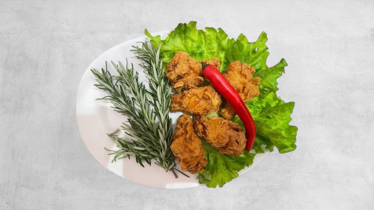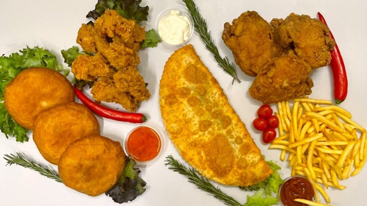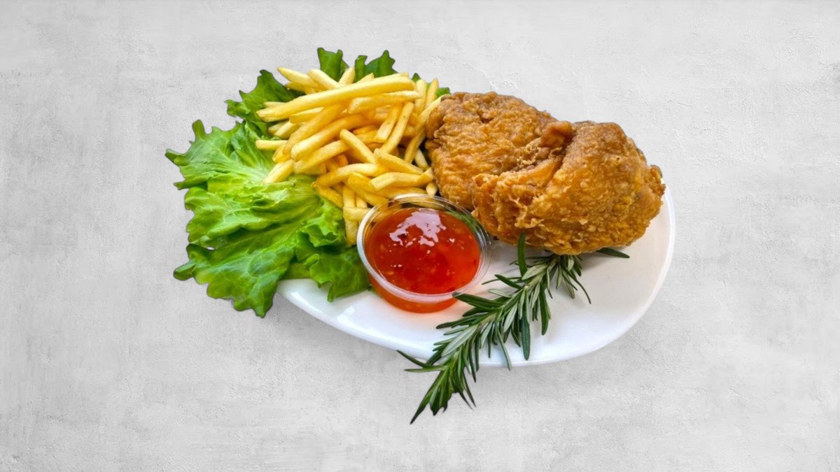 Vistas pusspārni ar kartupeļiem frī, mērci un dzērienu