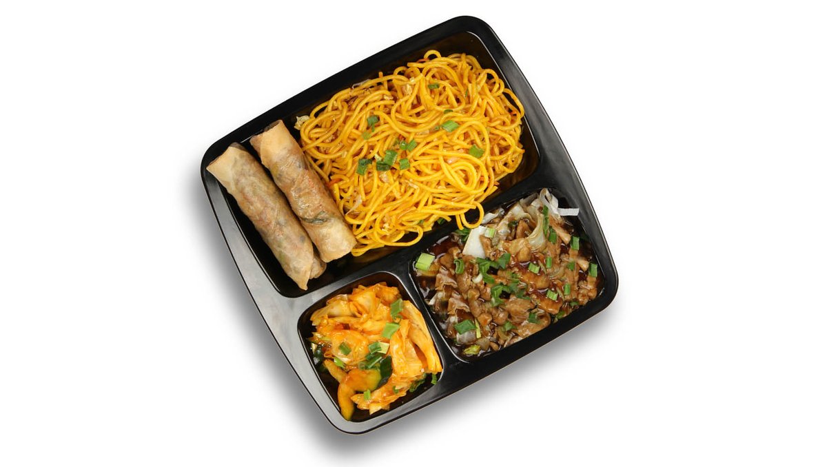Cūkgaļa, dārzeņi, pavasara rullīši, nūdeles vai rīsi, salāti