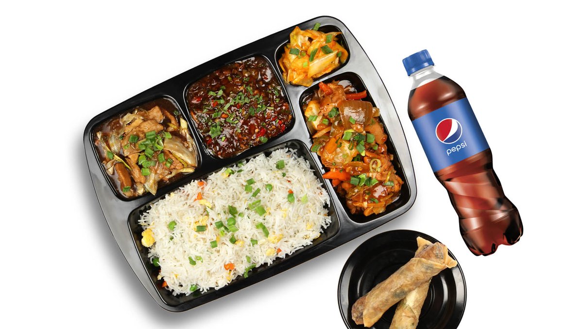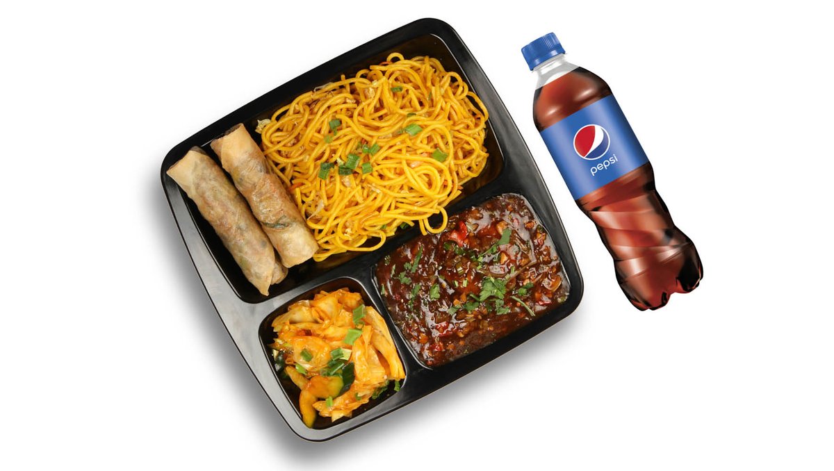 Dārzeņi asajā ķiploku mērcē, pavasara rullīši, nūdeles ar olu vai rīsi ar olu, salāti + Pepsi/7UP/Mirinda