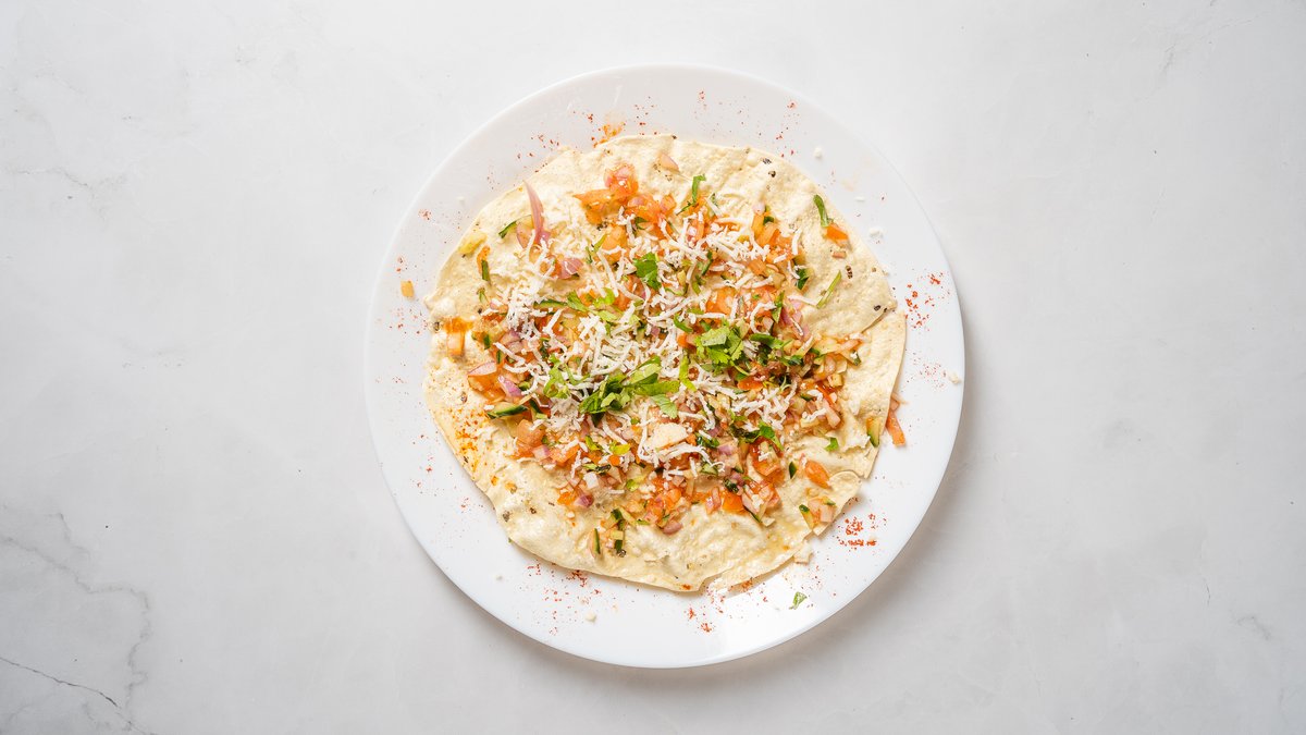 Plānas lēcu čipsi, garnēti ar sīpoliem, tomātiem un garšvielām | Thin lentil crisps garnished with onion and tomato & seasonings