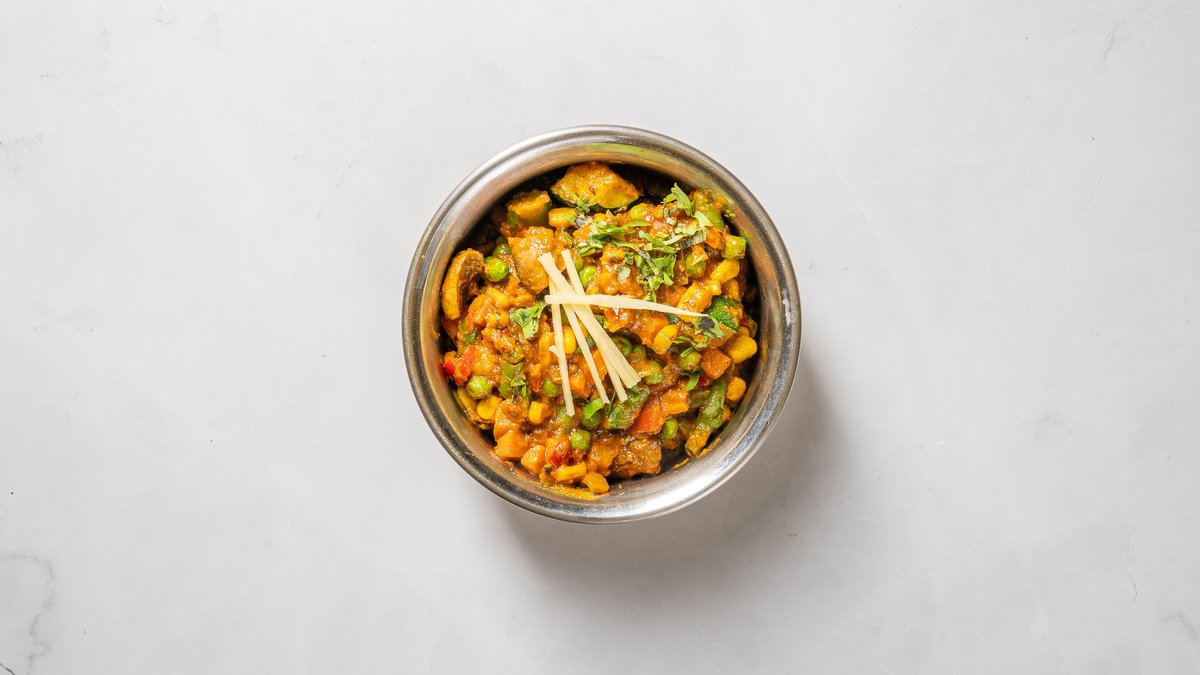 Pagatavots, kopā vārot dārzeņu maisījumu tradicionālajā indiešu karijā. | Made by cooking a mixture of vegetables together in a traditional indian curry