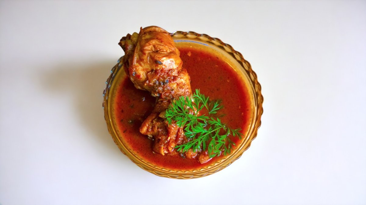 Sulīga vistas gaļa lēni vārīta bagātā, pikantā mērcē, pasniegta ar mīkstu parrotu