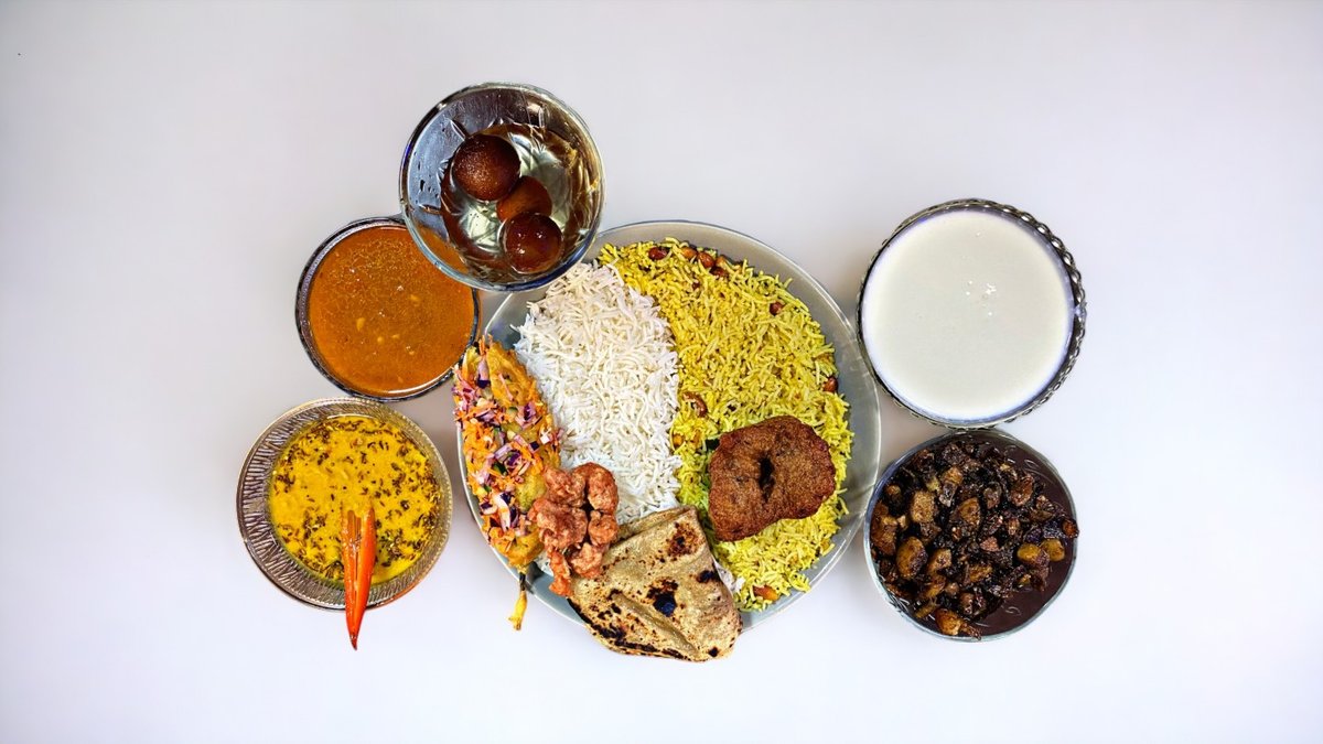 Starter + 2appadam + fritēta vista + vistas mērce + rasam/pappucharu + indiešu maize + tvaicēti rīsi + rīsi garšvielās + vārītas olas + 2 deserti + 2 dzērieni
